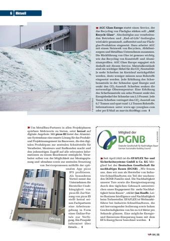 AGC Glass Europe startet einen Service, der das Recycling von Flachglas st%u00e4rken soll: %u201eAGC Recycle Glass%u201c. Abschnittglas aus verarbeitenden Betrieben und %u201eEnd-of-Life%u201c-Isolierglas wird aktiv gesammelt, aufbereitet und zur Flachglas-Produktion eingesetzt. Dazu arbeitet AGC mit einem Netzwerk von Recyclern, Abfallentsorgern und Metallbau-Unternehmen zusammen. Die R%u00fcckf%u00fchrung von Glas ist genauso wichtig, wie das Recycling von Kunststoff- und Aluminiumprofilen. AGC Glass Europe engagiert sich deshalb mit diesem Service. Materialkreisl%u00e4ufe sind ein wichtiger Hebel f%u00fcr die CO2-Neutralit%u00e4t: Je mehr Scherben im Kreislauf zur%u00fcckgef%u00fchrt werden, desto weniger m%u00fcssen neue Rohstoffe eingesetzt werden. Jede Erh%u00f6hung des Scherbenanteils in der Schmelze spart Energie und senkt den CO2-Aussto%u00df. Scherben senken die notwendige Ofentemperatur: Eine Erh%u00f6hung des Scherbenanteils um zehn Prozent senkt den Energiebedarf der Schmelze um 2,5 Prozent. Jede Tonne Scherben verringert den CO2-Aussto%u00df um 0,7 Tonnen und spart rund 1,2 Tonnen Rohstoffe. Informationen unter www.agc-yourglass.com Foto: AGC Glassoder per E-Mail an marvin.thiel@agc.com y Um Metallbau-Partnern in allen Projektphasen sp%u00fcrbare Mehrwerte zu bieten, setzt heroal auf digitale Angebote. Mit picos ID bietet das Aluminium-Systemhaus eine smarte L%u00f6sung f%u00fcr das Produktund Projektmanagement im Bauwesen, die den digitalen Produktpass zur zentralen Schnittstelle f%u00fcr Verarbeiter, Monteure und Endkunden macht und den jederzeitigen Zugriff auf alle relevanten Informationen zu einem Bauelement erm%u00f6glicht. Verarbeiter sollen von der M%u00f6glichkeit zur Montageplanung und -abnahme sowie zur zentralen Steuerung von Serviceprozessen mithilfe der optionalen App picos IFS profitieren. Als besonderen Vorteil nennt das Unternehmen die Hersteller-Unabh%u00e4ngigkeit von picos ID. Zur Nutzung von picos ID stellt heroal seinen Fachpartnern eine Arbeitsumgebung in Form eines Online-Portals zur Verf%u00fcgung. Ein Prospekt informiert %u00fcber Details%u2026 yFoto: heroalGrafik: DGNB Seit April 2025 ist die EFAFLEX Tor- und Sicherheitssysteme GmbH & Co. KG Mitglied bei der Deutschen Gesellschaft f%u00fcr nachhaltiges Bauen (DGNB). %u201eWir freuen uns, dass wir nun als Hersteller von Industrie-Schnelllauftoren ein Teil der wachsenden DGNB-Familie sind. Die Nachhaltigkeit unserer Tore sowie die Energieeinsparung durch den t%u00e4glichen Gebrauch unterstreichen unser Engagement f%u00fcr mehr Nachhaltigkeit beim Bauen%u201c, erkl%u00e4rt Jan Hauffe, Leiter Business Intelligence und Nachhaltigkeit beim Torhersteller. EFAFLEX ist Weltmarktf%u00fchrer bei Industrie-Schnelllauftoren, die mit hervorragender Isolierung sowie hohen Geschwindigkeiten von bis zu 4,0 Meter pro Sekunde gl%u00e4nzen. Eine m%u00f6gliche Energieund Emissions-Einsparung kann mit dem EFA-EnergySaver berechnet werden. y6Aktuell04|25