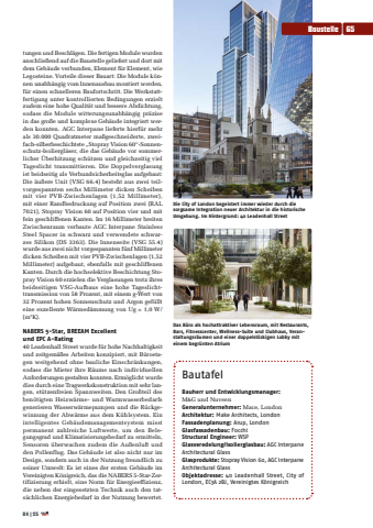 tungen und Beschl%u00e4gen. Die fertigen Module wurden anschlie%u00dfend auf die Baustelle geliefert und dort mit dem Geb%u00e4ude verbunden, Element f%u00fcr Element, wie Legosteine. Vorteile dieser Bauart: Die Module k%u00f6nnen unabh%u00e4ngig vom Innenausbau montiert werden, f%u00fcr einen schnelleren Baufortschritt. Die Werkstattfertigung unter kontrollierten Bedingungen erzielt zudem eine hohe Qualit%u00e4t und bessere Abdichtung, sodass die Module witterungsunabh%u00e4ngig pr%u00e4zise in das gro%u00dfe und komplexe Geb%u00e4ude integriert werden konnten. AGC Interpane lieferte hierf%u00fcr mehr als 30.000 Quadratmeter ma%u00dfgeschneiderte, zweifach-silberbeschichtete %u201eStopray Vision 60%u201c-Sonnenschutz-Isoliergl%u00e4ser, die das Geb%u00e4ude vor sommerlicher %u00dcberhitzung sch%u00fctzen und gleichzeitig viel Tageslicht transmittieren. Die Doppelverglasung ist beidseitig als Verbundsicherheitsglas aufgebaut: Die %u00e4u%u00dfere Unit (VSG 66.4) besteht aus zwei teilvorgespannten sechs Millimeter dicken Scheiben mit vier PVB-Zwischenlagen (1,52 Millimeter), mit einer Randbedruckung auf Position zwei (RAL 7021), Stopray Vision 60 auf Position vier und mit fein geschliffenen Kanten. Im 16 Millimeter breiten Zwischenraum verbaute AGC Interpane Stainless Steel Spacer in schwarz und verwendete schwarzes Silikon (DS 3363). Die Innenseite (VSG 55.4) wurde aus zwei nicht vorgespannten f%u00fcnf Millimeter dicken Scheiben mit vier PVB-Zwischenlagen (1,52 Millimeter) aufgebaut, ebenfalls mit geschliffenen Kanten. Durch die hochselektive Beschichtung Stopray Vision 60 erzielen die Verglasungen trotz ihres beidseitigen VSG-Aufbaus eine hohe Tageslichttransmission von 58 Prozent, mit einem g-Wert von 32 Prozent hohen Sonnenschutz und Argon gef%u00fcllt eine exzellente W%u00e4rmed%u00e4mmung von Ug = 1,0 W/(m2K).NABERS 5-Star, BREEAM Excellent und EPC A-Rating40 Leadenhall Street wurde f%u00fcr hohe Nachhaltigkeit und zeitgem%u00e4%u00dfes Arbeiten konzipiert, mit B%u00fcroetagen weitgehend ohne bauliche Einschr%u00e4nkungen, sodass die Mieter ihre R%u00e4ume nach individuellen Anforderungen gestalten konnten. Erm%u00f6glicht wurde dies durch eine Tragwerkskonstruktion mit sehr langen, st%u00fctzenfreien Spannweiten. Den Gro%u00dfteil des ben%u00f6tigten Heizw%u00e4rme- und Warmwasserbedarfs generieren Wasserw%u00e4rmepumpen und die R%u00fcckgewinnung der Abw%u00e4rme aus dem K%u00fchlsystem. Ein intelligentes Geb%u00e4udemanagementsystem misst permanent zahlreiche Luftwerte, um den Belegungsgrad und Klimatisierungsbedarf zu ermitteln, Sensoren %u00fcberwachen zudem die Au%u00dfenluft und den Pollenflug. Das Geb%u00e4ude ist also nicht nur im Design, sondern auch in der Nutzung freundlich zu seiner Umwelt: Es ist eines der ersten Geb%u00e4ude im Vereinigten K%u00f6nigreich, das die NABERS 5-Star-Zertifizierung erhielt, eine Norm f%u00fcr Energieeffizienz, die neben der eingesetzten Technik auch den tats%u00e4chlichen Energiebedarf in der Nutzung bewertet. BautafelBauherr und Entwicklungsmanager: M&G und NuveenGeneralunternehmer: Mace, LondonArchitektur: Make Architects, LondonFassadenplanung: Arup, LondonGlasfassadenbau: Focchi Structural Engineer: WSPGlasveredelung/Isolierglasbau: AGC Interpane Architectural Glass Glasprodukte: Stopray Vision 60, AGC Interpane Architectural GlassObjektadresse: 40 Leadenhall Street, City of London, EC3A 2BJ, Vereinigtes K%u00f6nigreichDie City of London begeistert immer wieder durch die sorgsame Integration neuer Architektur in die historische Umgebung. Im Hintergrund: 40 Leadenhall StreetDas B%u00fcro als hochattraktiver Lebensraum, mit Restaurants, Bars, Fitnesscenter, Wellness-Suite und Clubhaus, Veranstaltungsr%u00e4umen und einer doppelst%u00f6ckigen Lobby mit einem begr%u00fcnten AtriumBaustelle6504|25