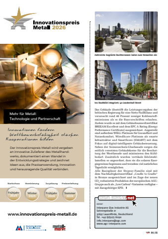 KONTAKTInterpane Glas Industrie AGSohnreystra%u00dfe 2137697 Lauenf%u00f6rde, DeutschlandTel. +49 (0)5273 8090info.interpane@agc.comwww.agc-interpane.comDas Geb%u00e4ude %u00fcbertrifft die Leistungsvorgaben der britischen Regierung f%u00fcr eine Netto-Nullbilanz und verursacht rund 40 Prozent weniger Kohlenstoffemissionen als es die Bauvorschriften erlauben. Zudem wurde es mit dem Geb%u00e4udeumweltzertifikat BREEAM Excellent und dem EPC A Rating (Energy Performance Certificate) ausgezeichnet. Angestrebt sind au%u00dferdem WELL Platinum f%u00fcr Gesundheit und Nutzerkomfort, WiredScore Platinum als smarte Infrastruktur und SmartScore (SMART) mit dem Fokus auf digital-intelligente Geb%u00e4udesteuerung. Neben der Sonnenschutz-Glasfassade sorgen die seitlich versetzten Geb%u00e4udekerne f%u00fcr die Beschattung der Westfassade und minimieren den K%u00fchlbedarf. Zus%u00e4tzlich wurden vertikale Edelstahllamellen so angeordnet, dass sie die solaren Energiegewinne begrenzen und trotzdem viel nat%u00fcrliches Tageslicht erm%u00f6glichen. Alle Basisgl%u00e4ser der Stopray-Familie sind mit dem Nachhaltigkeitszertifikat %u201eCradle to Cradle%u201c in Bronze ausgezeichnet und im Zuge der neuen CO2-reduzierten Produktion der europ%u00e4ischen AGCGruppe auch als %u201eLow Carbon%u201c-Varianten verf%u00fcgbar %u2013 mit dazugeh%u00f6riger EPD. %u2759Zahlreiche begr%u00fcnte Dachterrassen laden zum Verweilen einIns Stadtbild integriert: 40 Leadenhall Street04|25 Innovationen f%u00f6rdern Wettbewerbsf%u00e4higkeit st%u00e4rken Kooperationen bilden Mehr f%u00fcr Metall: Technologie und Partnerschaft www.innovationspreis-metall.deDer Innovationspreis Metall wird vergeben an innovative Zulieferer des Metallhandwerks, dokumentiert einen Wandel in der Entwicklungsstrategie und zeichnetIdeen aus, die Praxisanwendung, Innovationund herausragende Qualit%u00e4t verbinden. StartschussNominierungJurysitzungPreisverleihungWinter2025Fr%u00fchjahr2026Sommer2026Fr%u00fchjahr2025