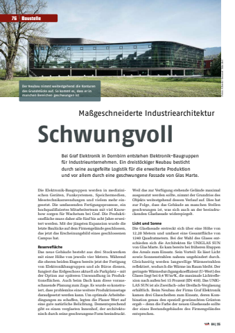 Fotos: Albrecht Imanuel SchnabelMa%u00dfgeschneiderte IndustriearchitekturSchwungvollBei Graf Elektronik in Dornbirn entstehen Elektronik-Baugruppen f%u00fcr Industrieunternehmen. Ein dreist%u00f6ckiger Neubau besticht durch seine ausgefeilte Logistik f%u00fcr die erweiterte Produktion und vor allem durch eine geschwungene Fassade von Glas Marte.Die Elektronik-Baugruppen werden in medizinischen Ger%u00e4ten, Funksystemen, Speichermedien, Messtechnikanwendungen und vielem mehr eingesetzt. Die umfassenden Fertigungsprozesse, ein hochqualifiziertes Mitarbeiterteam mit viel Knowhow sorgen f%u00fcr Wachstum bei Graf. Die Produktionsfl%u00e4che muss daher alle f%u00fcnf bis acht Jahre erweitert werden. Mit der j%u00fcngsten Expansion wurde die letzte Baul%u00fccke auf dem Firmengel%u00e4nde geschlossen, das jetzt das Erscheinungsbild eines geschlossenen Campus hat.Reservefl%u00e4cheDas neue Geb%u00e4ude besteht aus drei Stockwerken mit einer H%u00f6he von jeweils vier Metern. W%u00e4hrend die oberen beiden Etagen bereits jetzt der Fertigung von Elektronikbaugruppen und als B%u00fcros dienen, fungiert das Erdgeschoss aktuell als Parkplatz %u2013 mit der Option zur sp%u00e4teren Umwandlung in Produktionsfl%u00e4chen. Auch beim Dach kam diese vorausschauende Planung zum Zuge. Es wurde so konstruiert, dass problemlos eine weitere Produktionsetage daraufgesetzt werden kann. Um optimale Arbeitsbedingungen zu schaffen, legten die Planer Wert auf eine gute nat%u00fcrliche Belichtung. Dementsprechend gibt es einen verglasten Innenhof, der architektonisch durch seine geschwungene Form beeindruckt. Weil das zur Verf%u00fcgung stehende Gel%u00e4nde maximal ausgenutzt werden sollte, nimmt der Grundriss des Objekts weitestgehend dessen Verlauf auf. Dies hat zur Folge, dass das Geb%u00e4ude an manchen Stellen geschwungen ist, was sich auch an der beeindruckenden Glasfassade widerspiegelt. Licht und SonneDie Glasfassade erstreckt sich %u00fcber eine H%u00f6he von 12,20 Metern und umfasst eine Gesamtfl%u00e4che von 1240 Quadratmetern. Bei der Wahl des Glases entschieden sich die Architekten f%u00fcr UNIGLAS SUN von Glas Marte. Es kam bereits bei fr%u00fcheren Etappen des Areals zum Einsatz. Sein Vorteil: Es l%u00e4sst Licht sowie Sonnenstrahlen nahezu ungehindert durch. Gleichzeitig werden langwellige W%u00e4rmestrahlen reflektiert, wodurch die W%u00e4rme im Raum bleibt. Der geringste W%u00e4rmedurchgangskoeffizient (U-Wert) des Glases liegt bei 0,4 W/m%u00b2K, die maximale Lichtreflexion nach au%u00dfen bei 15 Prozent (EN 410). Das UNIGLAS SUN ist als Zweifach- oder Dreifach-Verglasung erh%u00e4ltlich. Beim Neubau der Firma Graf Elektronik kamen drei Glasscheiben zum Einsatz, deren Kombination genau den speziell gew%u00fcnschten Gr%u00fcnton ergab %u2013 denn die Farbe der neuen Glasfassade sollte der eines Bestandsgeb%u00e4udes des Firmengel%u00e4ndes entsprechen. Der Neubau nimmt weitestgehend die Konturen des Grundst%u00fccks auf. So kommt es, dass er in manchen Bereichen geschwungen ist76Baustelle04|25