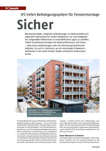 SFS liefert Befestigungssystem f%u00fcr FenstermontageSicherWachsende St%u00e4dte, steigende Anforderungen an Wohnqualit%u00e4t und begrenzte Fl%u00e4chenreserven stellen Stadtplaner vor neue Aufgaben: Um zeitgem%u00e4%u00dfen Wohnraum in innerst%u00e4dtischen Lagen zu schaffen, r%u00fccken zunehmend Konzepte der Nachverdichtung in den Fokus %u2013 etwa durch Aufstockungen oder die Umnutzung bestehender Geb%u00e4ude. So auch in Karlsruhe, wo ein ehemaliges Schwesternwohnheim in der Josef-Schofer-Stra%u00dfe umfassend modernisiert wurde.In innerst%u00e4dtischen Lagen sto%u00dfen klassische Neubauprojekte h%u00e4ufig an ihre Grenzen %u2013 sei es durch Fl%u00e4chenmangel, bauliche Dichte oder gestiegene Anforderungen an Nachhaltigkeit und Energieeffizienz. Sanierungs- und Umnutzungsma%u00dfnahmen gewinnen daher zunehmend an Bedeutung. Sie erm%u00f6glichen es, vorhandene Bausubstanz zukunftsf%u00e4hig weiterzuentwickeln und gleichzeitig den Fl%u00e4chenverbrauch zu minimieren. Ein gelungenes Beispiel f%u00fcr eine solche Umnutzung findet sich in der Karlsruher Nordweststadt. Entstanden sind 45 barrierearme Wohnungen %u2013 realisiert durch eine Aufstockung, eine neue thermische H%u00fclle und vorgestellte Balkonanlagen. F%u00fcr die absturzsichernde Fensterbefestigung kam das bauaufsichtlich zugelassene Befestigungssystem JB-D/FA PLUS mit Mauerwerksklemme von SFS zum Einsatz.Neuer Wohnraum im BestandIn direkter N%u00e4he zum Naturschutzgebiet %u201eAlter Flugplatz%u201c befindet sich das sanierte Geb%u00e4ude in der Josef-Schofer-Stra%u00dfe. Es wurde 1970 als SchwesternNach umfassender Sanierung und Aufstockung: das modernisierte Wohngeb%u00e4ude in der Josef-Schofer-Stra%u00dfe in Karlsruhe78Baustelle04|25Fotos: SFS