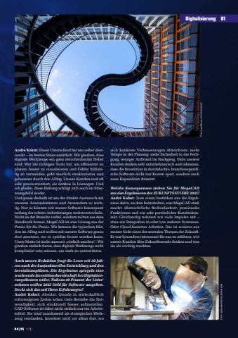 Andr%u00e9 Kohut: Dieser Unterschied hat uns selbst %u00fcberrascht %u2013 im besten Sinne nat%u00fcrlich. Wir glauben, dass digitale Werkzeuge ein ganz entscheidender Hebel sind. Wer die richtigen Tools hat, um effizienter zu planen, besser zu visualisieren und Fehler fr%u00fchzeitig zu vermeiden, geht deutlich strukturierter und gelassener durch den Alltag. Unsere Kunden sind oft sehr praxisorientiert, sie denken in L%u00f6sungen. Und ich glaube, diese Haltung schl%u00e4gt sich auch im Stimmungsbild nieder. Und genau deshalb ist uns der direkte Austausch mit unseren Anwenderinnen und Anwendern so wichtig. Nur so k%u00f6nnen wir unsere Software konsequent entlang der echten Anforderungen weiterentwickeln. Nicht an der Branche vorbei, sondern mitten aus dem Handwerk heraus. MegaCAD ist eine L%u00f6sung aus der Praxis f%u00fcr die Praxis. Wir kennen die typischen H%u00fcrden im Alltag und wollen mit unserer Software genau dort ansetzen, wo es sp%u00fcrbar besser werden kann. Unser Motto ist nicht umsonst %u201eeinfach machen%u201c. Wir glauben einfach daran, dass digitale Werkzeuge nicht kompliziert sein m%u00fcssen, um stark zu unterst%u00fctzen.Auch unsere Redaktion fragt die Leser seit 30 Jahren nach der konjunkturellen Entwicklung und den Investitionspl%u00e4nen. Die Ergebnisse spiegeln eine wachsende Investitionsbereitschaft bei Digitalisierungsthemen wider. Nahezu 40 Prozent der Unternehmen wollen 2025 Geld f%u00fcr Software ausgeben. Deckt sich das mit Ihren Erfahrungen?Andr%u00e9 Kohut: Absolut. Gerade in wirtschaftlich schwierigeren Zeiten sehen viele Betriebe die Notwendigkeit, sich strukturell besser aufzustellen. CAD-Software ist dabei nicht einfach nur ein Arbeitsmittel. Sie wird zunehmend als strategisches Werkzeug verstanden. Investiert wird vor allem dort, wo sich konkrete Verbesserungen abzeichnen: mehr Tempo in der Planung, mehr Sicherheit in der Fertigung, weniger Aufwand im Nachgang. Viele unserer Kunden denken sehr unternehmerisch und erkennen, dass die Investition in durchdachte, branchenspezifische Software nicht nur Kosten spart, sondern auch neue Kapazit%u00e4ten freisetzt. Welche Konsequenzen ziehen Sie f%u00fcr MegaCAD aus den Ergebnissen der ZUKUNFTSSTUDIE 2025?Andr%u00e9 Kohut: Zum einen best%u00e4rken uns die Ergebnisse darin, an dem festzuhalten, was MegaCAD stark macht: %u00fcbersichtliche Bedienbarkeit, praxisnahe Funktionen und ein sehr pers%u00f6nlicher Kundenkontakt. Gleichzeitig nehmen wir viele Impulse mit %u2013 etwa zur Integration in oder von anderen Systemen. Oder Cloud-basiertes Arbeiten. Das ist sowieso aus meiner Sicht eines der zentralen Themen der Zukunft. Es war besonders interessant f%u00fcr uns zu erfahren, wie unsere Kunden %u00fcber Zukunftstrends denken und was sie als wichtig erachten. Foto: JeanMaurice/AdobeStockFoto: industrieblick/AdobeStockDigitalisierung8104|25