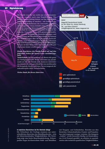 Viele der Befragten schauen mit Zuversicht in die ZukunftFoto: AdobeStock_RiskiDwiKONTAKTMegaCAD Deutschland GmbHAn der Alster 63, 20099 HamburgTel. +49 (0)40 5079730info@megacad.de, www.megacad.deIn welchen Bereichen ist Ihr Betrieb t%u00e4tig?Die Teilnehmer der Umfrage stammen aus unterschiedlichen Bereichen des Metallhandwerks %u2013 teils mit %u00fcberschneidenden T%u00e4tigkeitsfeldern. Die Verteilung zeigt eine breite Branchenabdeckung. Schwerpunkte liegen im klassischem Stahl- und Metallbau 11,3 %26,0 %60,5 %3,2 %sehr optimistischgem%u00e4%u00dfigt optimistischgem%u00e4%u00dfigt pessimistischsehr pessimistischmit Treppen- und Gel%u00e4nderbau. Betriebe aus den Bereichen Schmiedearbeiten, Fenster- und Fassadenbau sind insgesamt weniger vertreten. Die Kategorie %u201eAndere%u201c wurde besonders h%u00e4ufig von Konstrukteuren (13,8 Prozent) gew%u00e4hlt; sie arbeiten in spezialisierten oder technisch spezifischen T%u00e4tigkeitsfeldern.Gesch%u00e4ftsf%u00fchrungMeisterKonstrukteurDie Studie war f%u00fcr uns nicht nur ein Erkenntnisgewinn, sondern auch eine Verpflichtung: Wir wollen unseren Beitrag leisten, um das Metallhandwerk zukunftsf%u00e4hig zu machen %u2013 mit Software, die sich an den Bed%u00fcrfnissen der Anwender orientiert, nicht umgekehrt. Genau deshalb sehen wir die Studie nicht als einmalige Momentaufnahme, sondern eher als Auftakt f%u00fcr einen kontinuierlichen Dialog mit der Branche. Unser Ziel ist es, noch genauer nachzufragen, wie sich Bed%u00fcrfnisse, Herausforderungen und Erwartungen im Metallbau entwickeln. So k%u00f6nnen wir Ver%u00e4nderungen %u00fcber die Zeit hinweg nachvollziehen, neue Anforderungen fr%u00fchzeitig erkennen und unser Produktportfolio gezielt weiterentwickeln. F%u00fcr uns ist klar: Echte N%u00e4he zur Praxis entsteht nur, wenn man immer wieder genau hinh%u00f6rt.Einige Ergebnisse der Studie haben wir auf den folgenden Seiten f%u00fcr unsere Leser zusammengefasst. Andr%u00e9 Kohut: Die Daten haben wir Ihnen sehr gerne zur Verf%u00fcgung gestellt. Wenn sich Leser von metallmarkt.net f%u00fcr alle Details und Analysen interessieren, k%u00f6nnen sie sich gern direkt bei uns melden oder die komplette Studie auf https://www.megacad.de/zukunftsstudie-2025/ herunterladen. Vielen Dank f%u00fcr dieses Interview.MetallbauStahlbauGel%u00e4nderbauTreppenbauSchmiedearbeitenFassadenbauFensterbauAndereAnzahl Nennungen030609012082Digitalisierung04 |25