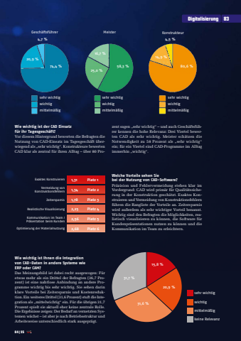 Wie wichtig ist Ihnen die Integration von CAD-Daten in andere Systeme wie ERP oder CAM?Das Meinungsbild ist dabei recht ausgewogen: F%u00fcr etwas mehr als ein Drittel der Befragten (36,7 Prozent) ist eine nahtlose Anbindung an andere Programme wichtig bis sehr wichtig. Sie sehen darin klare Vorteile bei Zeitersparnis und Kostenreduktion. Ein weiteres Drittel (31,6 Prozent) stuft die Integration als %u201emittelwichtig%u201c ein. F%u00fcr die %u00fcbrigen 31,7 Prozent spielt sie aktuell eher keine zentrale Rolle. Die Ergebnisse zeigen: Der Bedarf an vernetzten Systemen w%u00e4chst %u2013 ist aber je nach Betriebsstruktur und Arbeitsweise unterschiedlich stark ausgepr%u00e4gt.sehr wichtigwichtigmittelm%u00e4%u00dfigkeine RelevanzWie wichtig ist der CAD Einsatz f%u00fcr ihr Tagesgesch%u00e4ft?Vor diesem Hintergrund bewerten die Befragten die Nutzung von CAD-Einsatz im Tagesgesch%u00e4ft %u00fcberwiegend als %u201esehr wichtig%u201c. Konstrukteure bewerten CAD klar als zentral f%u00fcr ihren Alltag %u2013 %u00fcber 80 Prozent sagen %u201esehr wichtig%u201c %u2013 und auch Gesch%u00e4ftsf%u00fchrer kennen die hohe Relevanz: Drei Viertel bewerten CAD als sehr wichtig. Meister sch%u00e4tzen die Notwendigkeit zu 58 Prozent als %u201esehr wichtig%u201c ein; f%u00fcr ein Viertel sind CAD-Programme im Alltag immerhin %u201ewichtig%u201c.Gesch%u00e4ftsf%u00fchrersehr wichtigwichtigmittelm%u00e4%u00dfigsehr wichtigwichtigmittelm%u00e4%u00dfigsehr wichtigwichtigmittelm%u00e4%u00dfigMeisterKonstrukteur4,7 %74,4 %20,9 %16,7 %25,0 %14,9 %58,3 %80,6 %4,5 %Welche Vorteile sehen Sie bei der Nutzung von CAD-Software?Pr%u00e4zision und Fehlervermeidung stehen klar im Vordergrund: CAD wird prim%u00e4r f%u00fcr Qualit%u00e4tssicherung in der Konstruktion gesch%u00e4tzt. Exaktes Konstruieren und Vermeidung von Konstruktionsfehlern f%u00fchren die Rangliste der Vorteile an. Zeitersparnis wird au%u00dferdem als sehr wichtiger Vorteil benannt. Wichtig sind den Befragten die M%u00f6glichkeiten, realistisch visualisieren zu k%u00f6nnen, die Software f%u00fcr Kundenpr%u00e4sentationen nutzen zu k%u00f6nnen und die Kommunikation im Team zu erleichtern.Platz 1Platz 2Platz 3Platz 4Platz 5Platz 61,311,341,782,252,562,68Exaktes KonstruierenVermeidung von KonstruktionsfehlernZeitersparnisRealistische VisualisierungKommunikation im Team / Pr%u00e4sentation beim KundenOptimierung der Materialnutzung31,6 %20,9 %15,8 %31,7 %Digitalisierung8304|25