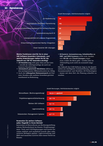Welche Funktionen sind f%u00fcr Sie in einer CAD-Software besonders interessant, und welche Entwicklungen halten Sie f%u00fcr die Zukunft von CAD f%u00fcr besonders wichtig?%u20223D-Modellierung steht ganz oben auf der Liste %u2013 sowohl als Arbeitsgrundlage als auch zur besseren Visualisierung.%u2022Automatisch generierte St%u00fccklisten z%u00e4hlen zu den meistgenannten Effizienzboostern im Alltag.%u2022Auch der reibungslose Datenaustausch mit Partnern, Kunden oder anderen Gewerken gewinnt zunehmend an Bedeutung.%u2022KI-basierte Automatisierung, Schnittstellen zu ERP- und BIM-Systemen sowie erste Ans%u00e4tze wie VR/AR oder Cloud-L%u00f6sungen zeigen zwar, wohin die Reise geht %u2013 werden aber im Arbeitsalltag noch nicht als essenziell eingestuft.Die Zukunft der CAD-Software liegt in der Kombination aus intelligenter Automatisierung, nahtloser Zusammenarbeit und flexiblen 3D-Technologien %u2013 immer mit dem Ziel, die Planung schneller zu machen.Verwenden Sie weitere Software au%u00dfer MegaCAD in Ihrem Betrieb?Inzwischen ist B%u00fcrosoftware zur Rechnungsstellung nahezu fl%u00e4chendeckend im Einsatz. Projektmanagement- Tools und CAD-Erg%u00e4nzungen sind bereits bei vielen etabliert und zus%u00e4tzlich jeweils %u00fcber zehn weiteren Befragten geplant. Lagerverwaltung und DMS sind immerhin noch bei %u00fcber einem Viertel im Foto: AdobeStock_RiskiDwiEinsatz.12110399464321163D-ModellierungAutomatische St%u00fccklisten-GenerierungZusammenarbeit/Datenaustausch mit Partnern/KundenAutomatisierung durch KIInteroperabilit%u00e4t mit anderen ProgrammenVirtual Reality/Augemented Reality-IntegrationCloud-basierte CAD-L%u00f6sungenAnzahl Nennungen, Mehrfachantworten m%u00f6glichAnzahl Nennungen, Mehrfachantworten m%u00f6glich155 ja + 1 geplant95 + 1075 + 1150 + 547 + 11B%u00fcrosoftware (Rechnungsstellung)Projektmanagement/ZeiterfassungWeitere CAD-SoftwareLagerverwaltungDokumenten-Management-Systeme84Digitalisierung04 |25