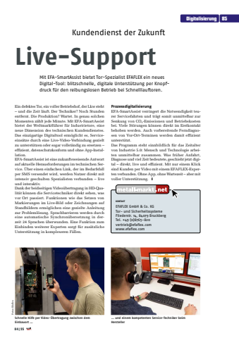 KONTAKTEFAFLEX GmbH & Co. KGTor- und SicherheitssystemeFliederstr. 14, 84079 BruckbergTel. +49 (0)8765-820vertrieb@efaflex.comwww.efaflex.comKundendienst der ZukunftLive-SupportMit EFA-SmartAssist bietet Tor-Spezialist EFAFLEX ein neues Digital-Tool: blitzschnelle, digitale Unterst%u00fctzung per Knopfdruck f%u00fcr den reibungslosen Betrieb bei Schnelllauftoren.Ein defektes Tor, ein voller Betriebshof, der Lkw steht %u2013 und die Zeit l%u00e4uft. Der Techniker? Noch Stunden entfernt. Die Produktion? Wartet. In genau solchen Momenten z%u00e4hlt jede Minute. Mit EFA-SmartAssist bietet der Weltmarktf%u00fchrer f%u00fcr Industrietore, eine neue Dimension des technischen Kundendienstes. Das einzigartige Digitaltool erm%u00f6glicht es, Serviceeins%u00e4tze durch eine Live-Video-Verbindung gezielt zu unterst%u00fctzen oder sogar vollst%u00e4ndig zu ersetzen %u2013 effizient, datenschutzkonform und ohne App-Installation.EFA-SmartAssist ist eine zukunftsweisende Antwort auf aktuelle Herausforderungen im technischen Service. %u00dcber einen einfachen Link, der im Bedarfsfall per SMS versendet wird, werden Nutzer direkt mit intensiv geschulten Spezialisten verbunden %u2013 live und interaktiv.Dank der beidseitigen Video%u00fcbertragung in HD-Qualit%u00e4t k%u00f6nnen die Servicetechniker direkt sehen, was vor Ort passiert. Funktionen wie das Setzen von Markierungen im Live-Bild oder Zeichnungen auf Standbildern erm%u00f6glichen eine gezielte Anleitung zur Probleml%u00f6sung. Sprachbarrieren werden durch eine automatische Synchron%u00fcbersetzung in derzeit 24 Sprachen %u00fcberwunden. Eine Funktion zum Einbinden weiterer Experten sorgt f%u00fcr zus%u00e4tzliche Unterst%u00fctzung in komplexeren F%u00e4llen.ProzessdigitalisierungEFA-SmartAssist verringert die Notwendigkeit teurer Servicefahrten und tr%u00e4gt somit unmittelbar zur Senkung von CO2-Emissionen und Betriebskosten bei. Viele St%u00f6rungen k%u00f6nnen direkt im Erstkontakt behoben werden. Auch vorbereitende Ferndiagnosen von Vor-Ort-Terminen werden damit effizient unterst%u00fctzt.Das Programm steht sinnbildlich f%u00fcr das Zeitalter von Industrie 5.0: Mensch und Technologie arbeiten unmittelbar zusammen. Was fr%u00fcher Anfahrt, Diagnose und viel Zeit bedeutete, geschieht jetzt digital %u2013 direkt, live und effizient. Mit nur einem Klick sind Kunden per Video mit einem EFAFLEX-Experten verbunden. Ohne App, ohne Wartezeit %u2013 aber mit voller Unterst%u00fctzung. ySchnelle Hilfe per Video-%u00dcbertragung zwischen dem Einbauort %u2026%u2026 und einem kompetenten Service-Techniker beim HerstellerFotos: EfaflexDigitalisierung8504|25