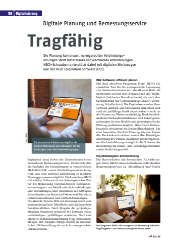 Digitale Planung und BemessungsserviceTragf%u00e4higDie Planung komplexer, normgerechter Verbindungsl%u00f6sungen stellt Metallbauer vor wachsende Anforderungen. HECO-Schrauben unterst%u00fctzt dabei mit digitalen Werkzeugen wie der HECO Calculation Software (HCS).Erg%u00e4nzend dazu bietet das Unternehmen einen kostenlosen Bemessungsservice. Zus%u00e4tzlich sind die Produkte des Unternehmens in verschiedenen 3D-CAD/CAM- sowie Statik-Programmen integriert, was eine nahtlose Einbindung in moderne Planungsprozesse erm%u00f6glicht. Die kostenlose HECO Calculation Software ist ein leistungsstarkes Tool f%u00fcr die Bemessung verschiedenster Schraubenanwendungen %u2013 von Metall- oder Holzverbindungen und Verst%u00e4rkungen %u00fcber Anschl%u00fcsse mit MMSplus Schraubankern an Beton und Mauerwerk bis hin zu Gel%u00e4nderanschl%u00fcssen und Aufdachd%u00e4mmungen. Die aktuelle Version HCS 4.0 %u00fcberzeugt durch eine benutzerfreundliche Oberfl%u00e4che und umfangreiche Funktionalit%u00e4ten. Nach Eingabe der projektspezifischen Parameter generiert die Software einen vollst%u00e4ndigen, pr%u00fcff%u00e4higen statischen Nachweis inklusive Schraubenempfehlung (Typ, Abmessung, Menge). Die Ausgabe erfolgt sowohl in anschaulicher 3D-Darstellung als auch in normgerechter Dokumentation. HBV-Software: effizient planen Mit dem aktuellen Programm bietet HECO ein spezielles Tool f%u00fcr die normgerechte Bemessung von Verbundsystemen mit Metall oder Holz. Es unterst%u00fctzt sowohl den Grenzzustand der Tragf%u00e4higkeit (inklusive Brandnachweis) als auch den Grenzzustand der Gebrauchstauglichkeit (Verformung, Schallschutz). Die Ergebnisse werden %u00fcbersichtlich grafisch und tabellarisch dargestellt und sind als pr%u00fcff%u00e4hige Statik exportierbar %u2013 auch im dxf-Format zur Weiterverarbeitung. Dank frei definierbarer Deckenkonstruktionen und Befestigeranordnungen ist eine flexible und projektspezifische Planung problemlos m%u00f6glich. Detaillierte Rechenbeispiele erleichtern die Nachvollziehbarkeit. F%u00fcr eine besonders flexible Planung k%u00f6nnen Planer die Deckenkonstruktion sowie die Befestigeranordnung frei w%u00e4hlen. Zus%u00e4tzlich zur normgerechten Nachweisf%u00fchrung erm%u00f6glicht die Software die Berechnung f%u00fcr Einzel- und Verbundquerschnitte sowie Verbindungsmittel. Projektbezogene Unterst%u00fctzungF%u00fcr Bauvorhaben mit besonderen Anforderungen bietet HECO einen kostenlosen individuellen Bemessungsservice an. Metallbauer und Planer Die kostenlose Software erm%u00f6glicht die pr%u00e4zise Bemessung von Schrauben f%u00fcr Verbindungen oder Gel%u00e4nderbefestigungenFotos: HECODas Programm liefert die normgerechte Bemessung inklusive Tragf%u00e4higkeits- und Gebrauchstauglichkeitsnachweis86Digitalisierung04 |25