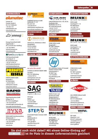 Sie sind noch nicht dabei? Mit einem Online-Eintrag aufist Ihr Platz in diesem Lieferverzeichnis gesichertSie sind noch nicht dabei? Mit einem Online-Eintrag aufist Ihr Platz in diesem Lieferverzeichnis gesichertGEHRUNGSS%u00c4GENelumatec AGPinacher Stra%u00dfe 61DE-75417 M%u00fchlacker+49 7041 14-0mail@elumatec.comwww.elumatec.comEmmegi Deutschland GmbHZeppelinstra%u00dfe 4DE-73119 Zell unter Aichelberg+49 7164 9400-0info.de@emmegi.comwww.emmegi.comFOM Deutschland GmbHVon-Liebig-Str. 42DE-33428 Harsewinkel+49 5247 40 38 2-0info@fomdeutschland.comwww.fomdeutschland.comPRESSTA-EISELE GmbHBergstra%u00dfe 9DE-56859 Bullay+49 6542 9362-0info@pressta-eisele.dewww.pressta-eisele.deRapid Maschinenbau GmbHBalinger Str. 29DE-72415 Grosselfingen+49 7476 91458-20vertrieb@rapid-maschinenbau.dewww.rapid-maschinenbau.deRYKO GmbH FensterbaumaschinenWilhelmstra%u00dfe 5-7DE-75203 K%u00f6nigsbach-Stein+49 7232 3018-0info@ryko.dewww.ryko.deSCHIRMER Maschinen GmbHStahlstra%u00dfe 25 + 29DE-33415 Verl+49 5246 9213-0info@schirmer-maschinen.comwww.schirmer-maschinen.comGESENKSCHMIEDEST%u00dcCKEImbach & Cie. AGSolutions in MetalSt%u00e4mpfelfeld 9CH-6244 Nebikon+41 62 748 4444imbach@imbach.comwww.imbach.comGEZOGENE DR%u00c4HTE GUTMANN ALUMINIUM DRAHT GMBHAm Sand 2DE-91781 Wei%u00dfenburg+49 9141 9975-0wire@gutmann-wire.comwww.gutmann-wire.comGIESSEREISAG GroupLend 25AT-5651 Lend+43 6416 65000aluminium@sag.atwww.sag.atST Extruded Products Germany GmbH STEP-GSchachenstra%u00dfe 14DE-88267 Vogt+49 7529 999-0vogt.office@step-g.comwww.step-g.comGLANZELOXIERENGalmak Al%u00fcminyum San. ve Tic. Ltd. %u015eti.Muallimk%u00f6y Mah., Muallimk%u00f6y Cad. No 13TR-41400 Gebze Kocaeli+90 262 7511557export@galmak.com.trwww.galmak.com.trGL%u00c4NZENSTARK ELOXAL GmbHHauptstra%u00dfe 1DE-79807 Lottstetten+49 7745 9232-0stark@stark-eloxal.dewww.stark-eloxal.deGLASBR%u00dcSTUNGENBUG Aluminium-Systeme ST Extruded Products Germany GmbHSchachenstra%u00dfe 14DE-88267 Vogt+49 7529 999-0bug.sales@step-g.comwww.bug.deGLASGEL%u00c4NDERFeBaTec Fenster- und Bauelemente GmbHTheodor-Gietl-Str. 5DE-83026 Rosenheim+498031268043info@febatec.comwww.febatec.comGLEICH-/WECHSELSTROMANLAGENMUNK GmbHGewerbepark 8 + 10DE-59069 Hamm+49 2385 74-0vertrieb@munk.dewww.munk.deGLEICHRICHTERGER%u00c4TEMUNK GmbHGewerbepark 8 + 10DE-59069 Hamm+49 2385 74-0vertrieb@munk.dewww.munk.deGLEICHSTROMVERSORGUNGENMUNK GmbHGewerbepark 8 + 10DE-59069 Hamm+49 2385 74-0vertrieb@munk.dewww.munk.deGLEITSCHLEIFANLAGENSTARK ELOXAL GmbHHauptstra%u00dfe 1DE-79807 Lottstetten+49 7745 9232-0stark@stark-eloxal.dewww.stark-eloxal.deGL%u00dcHEREIGebr. L%u00d6CHER Gl%u00fcherei GmbHM%u00fchlenseifen 2DE-57271 Hilchenbach+49 2733 8968-0info@loecher-glueherei.dewww.loecher-glueherei.deGOOGLE ADWORDSWIV GmbHClamecystr. 14-16DE-63571 Gelnhausen+49-(0)6051-9711-11info@wiv-gmbh.deww.wiv-gmbh.deLieferquellen91