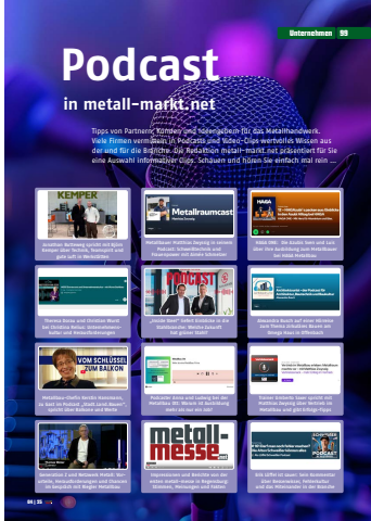 in metall-markt.netPodcastTipps von Partnern, Kunden und Ideengebern f%u00fcr das Metallhandwerk. Viele Firmen vermitteln in Podcasts und Video-Clips wertvolles Wissen aus der und f%u00fcr die Branche. Die Redaktion metall-markt.net pr%u00e4sentiert f%u00fcr Sie eine Auswahl informativer Clips. Schauen und h%u00f6ren Sie einfach mal rein %u2026Metallbau-Chefin Kerstin Hansmann, zu Gast im Podcast %u201eStadt.Land.Bauen%u201c, spricht %u00fcber Balkone und Werte Generation Z und Netzwerk Metall: Vorurteile, Herausforderungen und Chancen im Gespr%u00e4ch mit Riegler MetallbauTheresa Dorau und Christian Wurst bei Christina Relius: Unternehmenskultur und Herausforderungen Podcaster Anna und Ludwig bei der Metallbau Ott: Warum ist Ausbildung mehr als nur ein Job?%u201eInside Steel%u201c liefert Einblicke in die Stahlbranche: Welche Zukunft hat gr%u00fcner Stahl?Metallbauer Matthias Zwyssig in seinem Podcast: Schwei%u00dftechnik und Frauenpower mit Aim%u00e9e Schmelzer Trainer Umberto Saxer spricht mit Matthias Zwyssig %u00fcber Vertrieb im Metallbau und gibt Erfolgs-Tipps Alexandra Busch auf einer H%u00f6rreise zum Thema zirkul%u00e4res Bauen am Omega Haus in OffenbachHAGA ONE: Die Azubis Sven und Luis %u00fcber ihre Ausbildung zum Metallbauer bei HAGA MetallbauJonathan Butteweg spricht mit Bj%u00f6rn Kemper %u00fcber Technik, Teamspirit und gute Luft in Werkst%u00e4ttenImpressionen und Berichte von der ersten metall-messe in Regensburg: Stimmen, Meinungen und FaktenErik L%u00f6ffel ist sauer: Sein Kommentar %u00fcber Besserwisser, Fehlerkultur und das Miteinander in der BrancheUnternehmen9904|25