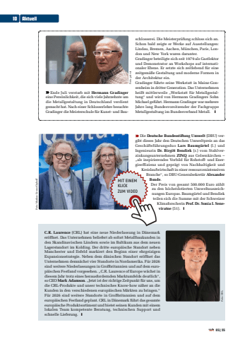 Ende Juli verstarb mit Hermann Gradingereine Pers%u00f6nlichkeit, die sich viele Jahrzehnte um die Metallgestaltung in Deutschland verdient gemacht hat. Nach einer Schlosserlehre besuchte Gradinger die Meisterschule f%u00fcr Kunst- und Bau- Die Deutsche Bundesstiftung Umwelt (DBU) vergibt dieses Jahr den Deutschen Umweltpreis an das Gesch%u00e4ftsf%u00fchrungsduo Lars Baumg%u00fcrtel (l.) und Ingenieurin Dr. Birgitt Bendiek (r.) vom Stahlverzinkungsunternehmen ZINQ aus Gelsenkirchen %u2013 %u201eals inspirierendes Vorbild f%u00fcr Rohstoff- und Energieeffizienz und gepr%u00e4gt von Nachhaltigkeit und Kreislaufwirtschaft in einer ressourcenintensiven Branche%u201c, so DBU-Generalsekret%u00e4r Alexander Bonde.Der Preis von gesamt 500.000 Euro z%u00e4hlt zu den h%u00f6chstdotierten Umweltauszeichnungen Europas. Baumg%u00fcrtel und Bendiek teilen sich die Summe mit der Schweizer Klimaforscherin Prof. Dr. Sonia I. Sene- Foto: Markus Grosse Ophoffviratne (51). yschlosserei. Die Meisterpr%u00fcfung schloss sich an. Schon bald zeigte er Werke auf Ausstellungen: Lindau, Bremen, Aachen, M%u00fcnchen, Paris, London und New York waren darunter.Gradinger beteiligte sich seit 1979 als Gastlektor und Demonstrator an Workshops auf internationaler Ebene. Er setzte sich zeitlebend f%u00fcr eine zeitgem%u00e4%u00dfe Gestaltung und moderne Formen in der Architektur ein. Gradinger f%u00fchrte seine Werkstatt in Mainz-Gonsenheim in dritter Generation. Das Unternehmen hei%u00dft mittlerweile %u201eWerkstatt f%u00fcr Metallgestaltung%u201c und wird von Hermann Gradingers Sohn Michael gef%u00fchrt. Hermann Gradinger war mehrere Jahre lang Bundesvorsitzender der Fachgruppe Metallgestaltung im Bundesverband Metall. yMIT EINEM KLICK ZUM VIDEOC.R. Laurence (CRL) hat eine neue Niederlassung in D%u00e4nemark er%u00f6ffnet. Das Unternehmen beliefert ab sofort Metallbaukunden in den Skandinavischen L%u00e4ndern sowie im Baltikum aus dem neuen Lagerstandort im Kolding. Der dritte europ%u00e4ische Standort neben Manchester und Ilsfeld markiert den Beginn einer ehrgeizigen Expansionsstrategie. Neben dem d%u00e4nischen Standort er%u00f6ffnet das Unternehmen demn%u00e4chst vier Standorte in Nordamerika. F%u00fcr 2026 sind weitere Niederlassungen in Gro%u00dfbritannien und auf dem europ%u00e4ischen Festland vorgesehen. %u201eC.R. Laurence of Europe w%u00e4chst in diesem Jahr trotz eines herausfordernden Marktumfelds deutlich%u201c, so CEO Mark Adamson. %u201eJetzt ist der richtige Zeitpunkt f%u00fcr uns, um die CRL-Produkte und unser technisches Know-how n%u00e4her an die Kunden in den verschiedenen europ%u00e4ischen M%u00e4rkten zu bringen.%u201c F%u00fcr 2026 sind weitere Standorte in Gro%u00dfbritannien und auf dem europ%u00e4ischen Festland geplant. CRL in D%u00e4nemark f%u00fchrt das gesamte europ%u00e4ische Produktsortiment und bietet seinen Kunden mit einem lokalen Team kompetente Beratung, technischen Support und schnelle Lieferung. yFoto: privatFoto: CRL10 Aktuell05|25