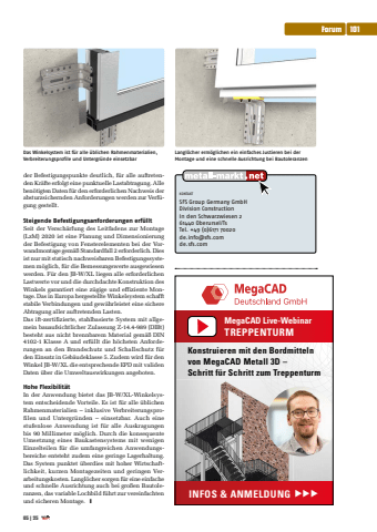 der Befestigungspunkte deutlich, f%u00fcr alle auftretenden Kr%u00e4fte erfolgt eine punktuelle Lastabtragung. Alle ben%u00f6tigten Daten f%u00fcr den erforderlichen Nachweis der absturzsichernden Anforderungen werden zur Verf%u00fcgung gestellt.Steigende Befestigungsanforderungen erf%u00fclltSeit der Versch%u00e4rfung des Leitfadens zur Montage (LzM) 2020 ist eine Planung und Dimensionierung der Befestigung von Fensterelementen bei der Vorwandmontage gem%u00e4%u00df Standardfall 2 erforderlich. Dies ist nur mit statisch nachweisbaren Befestigungssystemen m%u00f6glich, f%u00fcr die Bemessungswerte ausgewiesen werden. F%u00fcr den JB-W/XL liegen alle erforderlichen Lastwerte vor und die durchdachte Konstruktion des Winkels garantiert eine z%u00fcgige und effiziente Montage. Das in Europa hergestellte Winkelsystem schafft stabile Verbindungen und gew%u00e4hrleistet eine sichere Abtragung aller auftretenden Lasten. Das ift-zertifizierte, stahlbasierte System mit allgemein bauaufsichtlicher Zulassung Z-14.4-989 (DIBt) besteht aus nicht brennbarem Material gem%u00e4%u00df DIN 4102-1 Klasse A und erf%u00fcllt die h%u00f6chsten Anforderungen an den Brandschutz und Schallschutz f%u00fcr den Einsatz in Geb%u00e4udeklasse 5. Zudem wird f%u00fcr den Winkel JB-W/XL die entsprechende EPD mit validen Daten %u00fcber die Umweltauswirkungen angeboten. Hohe Flexibilit%u00e4tIn der Anwendung bietet das JB-W/XL-Winkelsystem entscheidende Vorteile. Es ist f%u00fcr alle %u00fcblichen Rahmenmaterialien %u2013 inklusive Verbreiterungsprofilen und Untergr%u00fcnden %u2013 einsetzbar. Auch eine stufenlose Anwendung ist f%u00fcr alle Auskragungen bis 90 Millimeter m%u00f6glich. Durch die konsequente Umsetzung eines Baukastensystems mit wenigen Einzelteilen f%u00fcr die umfangreichen Anwendungsbereiche entsteht zudem eine geringe Lagerhaltung. Das System punktet %u00fcberdies mit hoher Wirtschaftlichkeit, kurzen Montagezeiten und geringen Verarbeitungskosten. Langl%u00f6cher sorgen f%u00fcr eine einfache und schnelle Ausrichtung auch bei gro%u00dfen Bautoleranzen, das variable Lochbild f%u00fchrt zur vereinfachten und sicheren Montage. yDas Winkelsystem ist f%u00fcr alle %u00fcblichen Rahmenmaterialien, Verbreiterungsprofile und Untergr%u00fcnde einsetzbarLangl%u00f6cher erm%u00f6glichen ein einfaches Justieren bei derMontage und eine schnelle Ausrichtung bei BautoleranzenKONTAKTSFS Group Germany GmbHDivision ConstructionIn den Schwarzwiesen 261440 Oberursel/TsTel. +49 (0)6171 70020de.info@sfs.comde.sfs.comMegaCAD Live-WebinarTREPPENTURMINFOS & ANMELDUNG %uf075%uf075%uf075Konstruieren mit den Bordmitteln von MegaCAD Metall 3D %u2013 Schritt f%u00fcr Schritt zum TreppenturmForum 10105 | 25