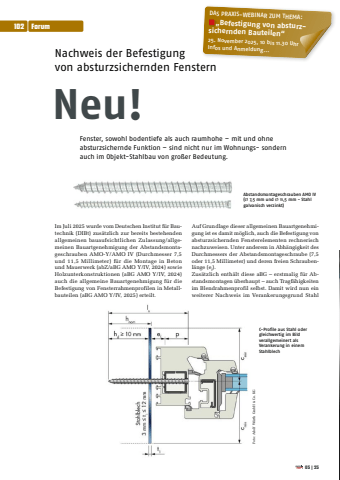 DAS PRAXIS-WEBINAR ZUM THEMA: %u201eBefestigung von absturzsichernden Bauteilen%u201c25. November 2025, 10 bis 11.30 UhrInfos und Anmeldung...Nachweis der Befestigung von absturzsichernden FensternNeu!Fenster, sowohl bodentiefe als auch raumhohe %u2013 mit und ohne absturzsichernde Funktion %u2013 sind nicht nur im Wohnungs- sondern auch im Objekt-Stahlbau von gro%u00dfer Bedeutung.Im Juli 2025 wurde vom Deutschen Institut f%u00fcr Bautechnik (DIBt) zus%u00e4tzlich zur bereits bestehenden allgemeinen bauaufsichtlichen Zulassung/allgemeinen Bauartgenehmigung der Abstandsmontageschrauben AMO-Y/AMO IV (Durchmesser 7,5 und 11,5 Millimeter) f%u00fcr die Montage in Beton und Mauerwerk (abZ/aBG AMO Y/IV, 2024) sowie Holzunterkonstruktionen (aBG AMO Y/IV, 2024) auch die allgemeine Bauartgenehmigung f%u00fcr die Befestigung von Fensterrahmenprofilen in Metallbauteilen (aBG AMO Y/IV, 2025) erteilt.Auf Grundlage dieser allgemeinen Bauartgenehmigung ist es damit m%u00f6glich, auch die Befestigung von absturzsichernden Fensterelementen rechnerisch nachzuweisen. Unter anderem in Abh%u00e4ngigkeit des Durchmessers der Abstandsmontageschraube (7,5 oder 11,5 Millimeter) und deren freien Schraubenl%u00e4nge (ef).Zus%u00e4tzlich enth%u00e4lt diese aBG %u2013 erstmalig f%u00fcr Abstandsmontagen %u00fcberhaupt %u2013 auch Tragf%u00e4higkeiten im Blendrahmenprofil selbst. Damit wird nun ein weiterer Nachweis im Verankerungsgrund Stahl Foto: Adolf W%u00fcrth GmbH & Co. KGAbstandsmontageschrauben AMO IV (%u00d8 7,5 mm und %u00d8 11,5 mm - Stahl galvanisch verzinkt)C-Profile aus Stahl oder gleichwertig im Bild verallgemeinert als Verankerung in einem Stahlblech102 Forum05|25