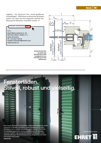 Rechteckhohlprofile aus Stahl oder gleichwertig im Bild verallgemeinert als Verankerung in zwei Stahlblechenm%u00f6glich %u2013 der Nachweis des %u201eleicht ge%u00f6ffneten Fensterfl%u00fcgels%u201c. F%u00e4llt dieser rechnerische Nachweis positiv aus, kann auf eine diagonale seitliche Verklotzung der Elemente verzichtet werden. yKONTAKTAdolf W%u00fcrth GmbH & Co. KGReinhold-W%u00fcrth-Stra%u00dfe 12-1774653 K%u00fcnzelsauTel. +49 7940 152009Juergen.Kueenzlen@wuerth.com www.wuerth.deMit unseren Aluminium-Fensterl%u00e4den verleihen Sie Geb%u00e4uden einen markanten Charakter und setzen gezielt Akzente, die mit jeder Architektur harmonisieren von traditionell bis modern. S%u00e4mtliche Fensterl%u00e4den lassen sich mit %u00fcber 4.000 Farben, 80 Modellen und 400 Varianten bis ins kleinste Detail individualisieren. Dank widerstandsf%u00e4higer Beschichtung sind sie pflegeleicht und bieten eine lange Lebensdauer.ehret.comFensterl%u00e4den.Stilvoll, robust und vielseitig.Forum 103