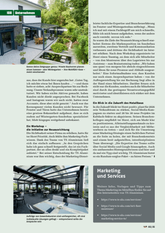 Marketing und ServicesWeitere Infos, Vorlagen und Tipps zum Thema Marketing im Metallbau finden Sie auf den Internetseiten von TS Aluminium.%u2022 https://www.ts-alu.com/services/%u2022 https://www.ts-alu.com/nr1-fuermonteure/%u2022 https://www.ts-alu.com/services/marketing-service-ts/aus, dass der Kunde hier angerufen hat: %u201aGuten Tag, ich m%u00f6chte etwas bei Ihnen kaufen %u2026%u2018 %u2013 und dann hatte er sieben, acht Ansprechpartner bis zur Rechnung. Unsere Verkaufsprozesse waren sehr unstrukturiert. Wir haben nichts Aktives gemacht, haben Kunden nicht direkt angesprochen. Bei Facebook und Instagram waren wir auch nicht, hatten zwar Accounts, diese aber nicht genutzt.%u201c Auch war das Kernsegment vielen Kunden nicht bewusst. F%u00fcr Fenster und T%u00fcren hatte das Unternehmen bereits eine gewisse Bekanntheit aufgebaut, dass es sich zudem auf Wintergarten-Sonderbau spezialisiert hat, blieb hingegen weitgehend unbekannt.Ein Workshop %u2013 die Initiative zur NeuausrichtungDie Sichtbarkeit seiner Firma zu erh%u00f6hen, hatte f%u00fcr ter Horst Priorit%u00e4t, doch fehlte ihm Marketing-Fachwissen. Dank des Teams von TS Aluminium lie%u00df sich das einfach aufbauen: %u201eIn den Gespr%u00e4chen habe ich ganz schnell festgestellt, das ist ein Fachpartner, der an alles denkt und ein Komplettpaket anbietet.%u201c Bei seiner Entscheidung f%u00fcr TS Aluminium war ihm wichtig, dass der Marketing-Dienstleister fachliche Expertise und Branchenerfahrung im Fenster- und Wintergartenbau mitbringt. %u201eWenn ich mal mit einem Fachbegriff um mich schmei%u00dfe, f%u00fchle ich mich besser aufgehoben, wenn der andere auch versteht, wovon ich rede.%u201cSo waren die Ziele der Neuausrichtung schnell erarbeitet: Erstens die Markenposition im Sonderbau ausweiten, zweitens Vertrieb und Kommunikation verbessern und drittens die Sichtbarkeit im Internet erh%u00f6hen. Nach dem Workshop organisierte ter Horst einen Teamtag, an dem sich alle Mitarbeiter %u2013 von den Monteuren %u00fcber den Lageristen bis zur Assistenz %u2013 zum Brainstorming trafen: %u201eWir haben uns quasi von morgens bis abends eingeschlossen und Ideen f%u00fcr neue Prozesse und Abl%u00e4ufe ausgearbeitet.%u201c Eine Sofortma%u00dfnahme war, dass Kunden nur noch einen Ansprechpartner haben %u2013 von der Auftragserstellung bis zur Rechnung liegt alles in der Hand eines Mitarbeiters. Dar%u00fcber freuen sich nicht nur die Kunden, sondern auch die Mitarbeiter sind durch das gestiegene Verantwortungsgef%u00fchl motivierter und identifizieren sich st%u00e4rker mit dem Unternehmen.Ein Blick in die Zukunft des MetallbausIn die Zukunft blickt ter Horst positiv, plant f%u00fcr 2026 sein Verkaufsteam zu st%u00e4rken, Social-Media-Kampagnen zu starten und 20 bis 30 neue Projekte im Kaltdach-Sektor zu akquirieren. Seinen Branchenkollegen empfiehlt ter Horst, sich am Markt klar zu positionieren, Alleinstellungsmerkmale zu kreieren und so aus der Vergleichbarkeit mit Mitbewerbern zu treten %u2013 und sich f%u00fcr die Umsetzung einer Marketing-Strategie einen fachlichen Partner an die Seite zu holen, der mit Branchenkenntnis und einem breit aufgestellten, interdisziplin%u00e4ren Team %u00fcberzeugt: %u201eDie Expertise des Teams sollte %u00fcber Social Media und Google hinausgehen. Auch ein umfassendes Hintergrundwissen und hier und da mal ein Tipp sind wichtig. TS Aluminium bietet so ein Rundum-sorglos-Paket %u2013 zu fairen Preisen.%u201c %u2759Kenne deine Zielgruppe genau: Private Bauherren planen einen Sommer- oder Wintergarten %u2013 ihre Wohlf%u00fchl-Oase %u2013 meist emotionalerFotos: TS-Aluminium-Profilsysteme GmbH & Co. KGAuftr%u00e4ge von Gewerbekunden sind umfangreicher, oft sind individuelle L%u00f6sungen gefragt %u2013 entsprechend sollte die Ansprache sein108 Unternehmen05|25