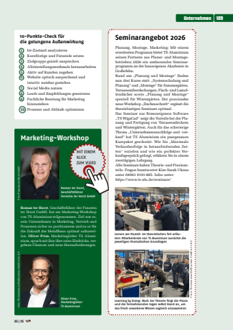 10-Punkte-Check f%u00fcr die gelungene Au%u00dfenwirkungMarketing-Workshop Roman ter Horst, Gesch%u00e4ftsf%u00fchrer der Fenestra ter Horst GmbH, hat am Marketing-Workshop von TS Aluminium teilgenommen. Ziel war es, sein Unternehmen in Marketing, Vertrieb und Prozessen sicher zu positionieren und es so f%u00fcr die Zukunft des Metallbaus optimal aufzustellen. Oliver Prim, Marketingleiter TS Aluminium, sprach mit ihm %u00fcber seine Eindr%u00fccke, vergebene Chancen und neue Herausforderungen.Roman ter Horst, Gesch%u00e4ftsf%u00fchrerFenestra ter Horst GmbH Foto: Fenestra ter Horst GmbH Foto: TS-Aluminium-Profilsysteme GmbH & Co. KGOliver Prim, Marketingleiter TS Aluminium1. Ist-Zustand analysieren2. Kurzfristige und Fernziele setzen3. Zielgruppe gezielt ansprechen4. Alleinstellungsmerkmale herausarbeiten5. Aktiv auf Kunden zugehen6. Website optisch ansprechend und intuitiv nutzbar gestalten7. Social Media nutzen8. Leads und Empfehlungen generieren9. Fachliche Beratung f%u00fcr Marketing hinzuziehen10. Prozesse und Abl%u00e4ufe optimierenSeminarangebot 2026Planung, Montage, Marketing: Mit einem erweiterten Programm bietet TS Aluminium seinen Partnern aus Planer- und Montagebetrieben 2026 ein umfassendes Seminarprogramm an der hauseigenen Akademie in Gro%u00dfefehn.Rund um %u201ePlanung und Montage%u201c finden nun drei Kurse statt: %u201eSystemschulung und Planung%u201c und %u201eMontage%u201c f%u00fcr Sommerg%u00e4rten, Terrassen%u00fcberdachungen, Flach- und Lamellend%u00e4cher sowie %u201ePlanung und Montage%u201c speziell f%u00fcr Winterg%u00e4rten. Der praxisnahe neue Workshop %u201eDachzuschnitt%u201c erg%u00e4nzt die theorielastigen Seminare optimal.Das Seminar zur firmeneigenen Software %u201eTS WigaCad%u201c zeigt die Vorteile bei der Planung und Fertigung von Terrassend%u00e4chern und Winterg%u00e4rten. Auch f%u00fcr das schwierige Thema %u201eUnternehmensnachfolge und -verkauf%u201c hat TS Aluminium ein passgenaues Kurspaket geschn%u00fcrt. Wie Sie %u201eMaximale Verkaufserfolge in herausfordernden Zeiten%u201c erzielen und wie ein perfektes Verkaufsgespr%u00e4ch gelingt, erfahren Sie in einem zweit%u00e4gigen Lehrgang.Alle Seminare haben Theorie- und Praxisanteile. Fragen beantwortet Kim-Sarah Ukena unter 04943 9191-805. Infos unter: https://www.ts-alu.de/seminare/Learning by Doing: Nach der Theorie folgt die Praxis und die Teilnehmenden legen selbst Hand an, um das frisch erworbene Wissen sogleich anzuwendenFotos: TS-Aluminium-Profilsysteme GmbH & Co. KGLernen am Modell: Im theoretischen Teil erl%u00e4utern Mitarbeitende von TS Aluminium zun%u00e4chst die jeweiligen thematischen GrundlagenMIT EINEM KLICK ZUM VIDEOUnternehmen 10905 | 25