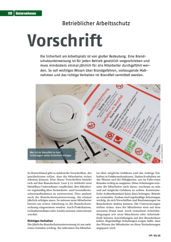 110 Unternehmen05|25Betrieblicher ArbeitsschutzVorschriftDie Sicherheit am Arbeitsplatz ist von gro%u00dfer Bedeutung. Eine Brandschutzunterweisung ist f%u00fcr jeden Betrieb gesetzlich vorgeschrieben und muss mindestens einmal j%u00e4hrlich f%u00fcr alle Mitarbeiter durchgef%u00fchrt werden. So soll wichtiges Wissen %u00fcber Brandgefahren, vorbeugende Ma%u00dfnahmen und das richtige Verhalten im Brandfall vermittelt werden.In Deutschland gibt es zahlreiche Vorschriften, die gew%u00e4hrleisten sollen, dass die Mitarbeiter sicher arbeiten k%u00f6nnen. Eine dieser Vorschriften bezieht sich auf den Brandschutz. Laut %u00a7 12 ArbSchG sind Metallbau-Unternehmer verpflichtet, ihre Mitarbeiter regelm%u00e4%u00dfig %u00fcber Sicherheits- und Gesundheitsschutzma%u00dfnahmen zu unterweisen. Dies umfasst auch die Brandschutzunterweisung, die einmal j%u00e4hrlich erfolgen muss. So m%u00fcssen neue Mitarbeiter bereits am ersten Arbeitstag in die Brandschutzordnung eingewiesen werden. Auch Praktikanten, Leiharbeitnehmer oder Azubis m%u00fcssen unterwiesen werden.Richtiges VerhaltenDie j%u00e4hrliche Brandschutzunterweisung ist aus mehreren Gr%u00fcnden wichtig. Sie informiert die Mitarbeiter %u00fcber m%u00f6gliche Gefahren und das richtige Verhalten in Gefahrensituationen. Dadurch erhalten sie das Wissen und die F%u00e4higkeiten, um im Falle eines Brandes richtig zu reagieren. Diese Schulungen erinnern die Mitarbeiter auch daran, wachsam zu sein und auf m%u00f6gliche Gefahren zu achten. Kontinuierliche Aufmerksamkeit kann dazu beitragen, Br%u00e4nde zu vermeiden. Zudem sind regelm%u00e4%u00dfige Schulungen wichtig, da sich Vorschriften und Bestimmungen im Brandschutz %u00e4ndern k%u00f6nnen. Die Unterweisungen stellen sicher, dass die Mitarbeiter stets auf dem neuesten Stand sind. Auch ver%u00e4nderte Arbeitsbedingungen wie neue Maschinen oder Arbeitsabl%u00e4ufe k%u00f6nnen Auswirkungen auf den Brandschutz haben. Regelm%u00e4%u00dfige Schulungen sorgen daf%u00fcr, dass das Wissen der Mitarbeiter an diese Ver%u00e4nderungen angepasst wird.Was ist im Brandfall zu tun?Schulungen sollen Sicherheit bringen Foto: maho/AdobeStock