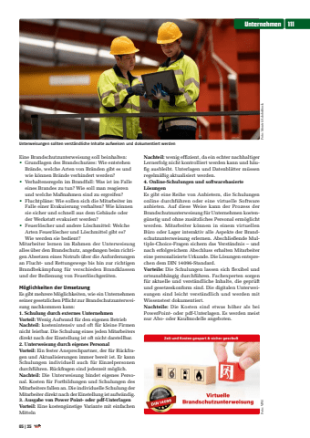 Unternehmen 11105 | 25Eine Brandschutzunterweisung soll beinhalten: %u2022 Grundlagen des Brandschutzes: Wie entstehen Br%u00e4nde, welche Arten von Br%u00e4nden gibt es und wie k%u00f6nnen Br%u00e4nde verhindert werden?%u2022 Verhaltensregeln im Brandfall: Was ist im Falle eines Brandes zu tun? Wie soll man reagieren und welche Ma%u00dfnahmen sind zu ergreifen?%u2022 Fluchtpl%u00e4ne: Wie sollen sich die Mitarbeiter im Falle einer Evakuierung verhalten? Wie k%u00f6nnen sie sicher und schnell aus dem Geb%u00e4ude oder der Werkstatt evakuiert werden?%u2022 Feuerl%u00f6scher und andere L%u00f6schmittel: Welche Arten Feuerl%u00f6scher und L%u00f6schmittel gibt es? Wie werden sie bedient? Mitarbeiter lernen im Rahmen der Unterweisung alles %u00fcber den Brandschutz, angefangen beim richtigen Absetzen eines Notrufs %u00fcber die Anforderungen an Flucht- und Rettungswege bis hin zur richtigen Brandbek%u00e4mpfung f%u00fcr verschieden Brandklassen und der Bedienung von Feuerl%u00f6schger%u00e4ten.M%u00f6glichkeiten der UmsetzungEs gibt mehrere M%u00f6glichkeiten, wie ein Unternehmen seiner gesetzlichen Pflicht zur Brandschutzunterweisung nachkommen kann:1. Schulung durch externes UnternehmenVorteil: Wenig Aufwand f%u00fcr den eigenen BetriebNachteil: kostenintensiv und oft f%u00fcr kleine Firmen nicht leistbar. Die Schulung eines jeden Mitarbeiters direkt nach der Einstellung ist oft nicht darstellbar.2. Unterweisung durch eigenes PersonalVorteil: Ein fester Ansprechpartner, der f%u00fcr R%u00fcckfragen und Aktualisierungen immer bereit ist. Er kann Schulungen individuell auch f%u00fcr Einzelpersonen durchf%u00fchren. R%u00fcckfragen sind jederzeit m%u00f6glich.Nachteil: Die Unterweisung bindet eigenes Personal. Kosten f%u00fcr Fortbildungen und Schulungen des Mitarbeiters fallen an. Die individuelle Schulung der Mitarbeiter direkt nach der Einstellung ist aufw%u00e4ndig.3. Ausgabe von Power Point- oder pdf-UnterlagenVorteil: Eine kosteng%u00fcnstige Variante mit einfachen MittelnNachteil: wenig effizient, da ein echter nachhaltiger Lernerfolg nicht kontrolliert werden kann und h%u00e4ufig ausbleibt. Unterlagen und Datenbl%u00e4tter m%u00fcssen regelm%u00e4%u00dfig aktualisiert werden.4. Online-Schulungen und softwarebasierte L%u00f6sungenEs gibt eine Reihe von Anbietern, die Schulungen online durchf%u00fchren oder eine virtuelle Software anbieten. Auf diese Weise kann der Prozess der Brandschutzunterweisung f%u00fcr Unternehmen kosteng%u00fcnstig und ohne zus%u00e4tzliches Personal erm%u00f6glicht werden. Mitarbeiter k%u00f6nnen in einem virtuellen B%u00fcro oder Lager interaktiv alle Aspekte der Brandschutzunterweisung erlernen. Abschlie%u00dfende Multiple-Choice-Fragen sichern das Verst%u00e4ndnis %u2013 und nach erfolgreichem Abschluss erhalten Mitarbeiter eine personalisierte Urkunde. Die L%u00f6sungen entsprechen dem DIN 14096-Standard.Vorteile: Die Schulungen lassen sich flexibel und ortsunabh%u00e4ngig durchf%u00fchren. Fachexperten sorgen f%u00fcr aktuelle und verst%u00e4ndliche Inhalte, die gepr%u00fcft und gesetzeskonform sind. Die digitalen Unterweisungen sind leicht verst%u00e4ndlich und werden mit Wissenstest dokumentiert.Nachteile: Die Kosten sind etwas h%u00f6her als beiPowerPoint- oder pdf-Unterlagen. Es werden meist nur Abo- oder Kaufmodelle angeboten.Foto: VPH Foto: Montri/AdobeStockUnterweisungen sollten verst%u00e4ndliche Inhalte aufweisen und dokumentiert werden