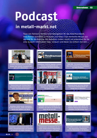 in metall-markt.netPodcastTipps von Partnern, Kunden und Ideengebern f%u00fcr das Metallhandwerk. Viele Firmen vermitteln in Podcasts und Video-Clips wertvolles Wissen aus der und f%u00fcr die Branche. Die Redaktion metall-markt.net pr%u00e4sentiert f%u00fcr Sie eine Auswahl informativer Clips. Schauen und h%u00f6ren Sie einfach mal rein %u2026Metallbau-Chefin Kerstin Hansmann, zu Gast im Podcast %u201eStadt.Land.Bauen%u201c, spricht %u00fcber Balkone und Werte Generation Z und Netzwerk Metall: Vorurteile, Herausforderungen und Chancen im Gespr%u00e4ch mit Riegler MetallbauTheresa Dorau und Christian Wurst bei Christina Relius: Unternehmenskultur und Herausforderungen Podcaster Anna und Ludwig bei der Metallbau Ott: Warum ist Ausbildung mehr als nur ein Job?%u201eInside Steel%u201c liefert Einblicke in die Stahlbranche: Welche Zukunft hat gr%u00fcner Stahl?Metallbauer Matthias Zwyssig in seinem Podcast: Schwei%u00dftechnik und Frauenpower mit Aim%u00e9e Schmelzer Trainer Umberto Saxer spricht mit Matthias Zwyssig %u00fcber Vertrieb im Metallbau und gibt Erfolgs-Tipps Alexandra Busch auf einer H%u00f6rreise zum Thema zirkul%u00e4res Bauen am Omega Haus in OffenbachHAGA ONE: Die Azubis Sven und Luis %u00fcber ihre Ausbildung zum Metallbauer bei HAGA MetallbauJonathan Butteweg spricht mit Bj%u00f6rn Kemper %u00fcber Technik, Teamspirit und gute Luft in Werkst%u00e4ttenImpressionen und Berichte von der ersten metall-messe in Regensburg: Stimmen, Meinungen und FaktenErik L%u00f6ffel ist sauer: Sein Kommentar %u00fcber Besserwisser, Fehlerkultur und das Miteinander in der Branche05 | 25Unternehmen 113
