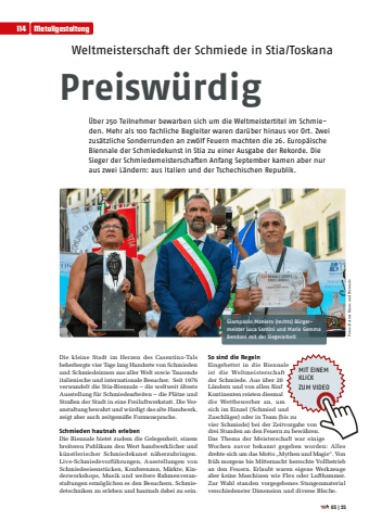 114 Metallgestaltung05|25Weltmeisterschaft der Schmiede in Stia/ToskanaPreisw%u00fcrdig%u00dcber 250 Teilnehmer bewarben sich um die Weltmeistertitel im Schmieden. Mehr als 100 fachliche Begleiter waren dar%u00fcber hinaus vor Ort. Zwei zus%u00e4tzliche Sonderrunden an zw%u00f6lf Feuern machten die 26. Europ%u00e4ische Biennale der Schmiedekunst in Stia zu einer Ausgabe der Rekorde. Die Sieger der Schmiedemeisterschaften Anfang September kamen aber nur aus zwei L%u00e4ndern: aus Italien und der Tschechischen Republik. Die kleine Stadt im Herzen des Casentino-Tals beherbergte vier Tage lang Hunderte von Schmieden und Schmiedeinnen aus aller Welt sowie Tausende italienische und internationale Besucher. Seit 1976 verwandelt die Stia-Biennale %u2013 die weltweit %u00e4lteste Ausstellung f%u00fcr Schmiedearbeiten %u2013 die Pl%u00e4tze und Stra%u00dfen der Stadt in eine Freiluftwerkstatt. Die Veranstaltung bewahrt und w%u00fcrdigt das alte Handwerk, zeigt aber auch zeitgem%u00e4%u00dfe Formensprache. Schmieden hautnah erlebenDie Biennale bietet zudem die Gelegenheit, einem breiteren Publikum den Wert handwerklicher und k%u00fcnstlerischer Schmiedekunst n%u00e4herzubringen. Live-Schmiedevorf%u00fchrungen, Ausstellungen von Schmiedeeisenst%u00fccken, Konferenzen, M%u00e4rkte, Kinderworkshops, Musik und weitere Rahmenveranstaltungen erm%u00f6glichen es den Besuchern, Schmiedetechniken zu erleben und hautnah dabei zu sein.So sind die RegelnEingebettet in die Biennale ist die Weltmeisterschaft der Schmiede. Aus %u00fcber 20 L%u00e4ndern und von allen f%u00fcnf Kontinenten reisten diesmal die Wettbewerber an, um sich im Einzel (Schmied und Zuschl%u00e4ger) oder in Team (bis zu vier Schmiede) bei der Zeitvorgabe von drei Stunden an den Feuern zu bew%u00e4hren. Das Thema der Meisterschaft war einige Wochen zuvor bekannt gegeben worden: Alles drehte sich um das Motto %u201eMythen und Magie%u201c. Von fr%u00fch morgens bis Mitternacht herrschte Vollbetrieb an den Feuern. Erlaubt waren eigene Werkzeuge aber keine Maschinen wie Flex oder Lufthammer. Zur Wahl standen vorgegebenes Stangenmaterial verschiedenster Dimension und diverse Bleche.Fotos: Rainer Kraus und BiennaleGiampaolo Maniero (rechts) B%u00fcrgermeister Luca Santini und Maria Gemma Bendoni mit der SiegerarbeitMIT EINEM KLICK ZUM VIDEO