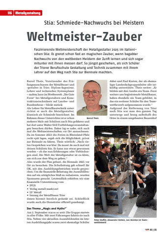 Stia: Schmiede-Nachwuchs bei MeisternWeltmeister-ZauberFaszinierende Weltmeisterschaft der Metallgestalter 2025 im italienischen Stia: Es grenzt schon fast an magischen Zauber, wenn begabter Nachwuchs von den weltbesten Meistern der Zunft lernen und sich sogar mitunter mit ihnen messen darf. So j%u00fcngst geschehen, als sich Sch%u00fcler der Trierer Berufsschule Gestaltung und Technik zusammen mit ihrem Lehrer auf den Weg nach Stia zur Biennale machten.116 Metallgestaltung05|25Bernd Theis, Vorsitzender des Pr%u00fcfungsausschusses der Metallbauer und -gestalter in Trier, Diplom-Ingenieur, Lehrer und technischer Systemplaner %u2013 zudem Juror im Wettbewerb %u201eDie Gute Form%u201c bei Metallgestaltern und Konstruktionstechnikern auf Landes- und Bundesebene %u2013 blickt zur%u00fcck:Als Lehrer f%u00fcr Metallbautechnik unterrichtet er auch die Metallgestalter, klassisch als Schmiede bezeichnet. Im Rahmen dieses Unterrichtes ist er schon mehrere Male mit Sch%u00fclern nach Stia gefahren und hat dort unter Walter Still Fortbildungsveranstaltungen besuchen d%u00fcrfen. Daher lag es nahe, sich auch mal die Weltmeisterschaften vor Ort anzuschauen. Da im Sommer 2023 die Ferien in Rheinland-Pfalz recht sp%u00e4t lagen, ergab sich die M%u00f6glichkeit, privat zur Biennale zu fahren. Theis w%u00f6rtlich: %u201eNach vielen Gespr%u00e4chen war klar: Da musst du auch mal mit deinen Sch%u00fclern hin. Es kann nur etwas gewonnen werden %u2013 ob das nun Erfahrungen oder Verbindungen sind. Die Welt der Metallgestalter ist zu klein, um sich aus dem Weg zu gehen.%u201cAlso wurde der Plan gefasst, die Biennale 2025 vor Ort zu besuchen. Die Schulleitung gab schnell ihr OK, mit den Ausbildungsbetrieben wurde gesprochen. Um die finanzielle Belastung der Auszubildenden auf ein ertr%u00e4gliches Ma%u00df zu reduzieren, wurden Sponsoren gesucht. Letztendlich erhielten wir eine finanzielle Unterst%u00fctzung vom:%u2022 IFGS%u2022 Verlag metall-markt.net%u2022 LV Metall%u2022 Innung der Metallbauer Trierdenen hiermit herzlich gedankt sei. Schlie%u00dflichwurde auch die Dienstreise offiziell genehmigt.Das Thema %u201eMagic and Myths%u201c%u00b4Am 2. September war es so weit: Die Gruppe startete in aller Fr%u00fche. Mit zwei Fahrzeugen fuhren sie nach Stia. Neben vier aktuellen Auszubildenden im letzten Ausbildungsjahr waren zwei ehemalige Sch%u00fcler dabei und Paul Kreten, der als ehemaliger Landesfachgruppenleiter alle tatkr%u00e4ftig unterst%u00fctzte. Theis weiter: %u201eEr bildete mit drei Azubis ein Team. Zwei weitere uns begleitetende Metallbauer, haben ebenfalls ein Team gebildet, in das ein weiterer Sch%u00fcler f%u00fcr den Teamwettbewerb aufgenommen wurde.%u201cAufgrund der Entfernung von Trier nach Stia war man den ganzen Tag unterwegs und bezog au%u00dferhalb des Bernd Theis Ortes in einem umgebauten Bauernhof Peter Stoffel, Alexander Kreten, Leo Heintze im Teamwettbewerb