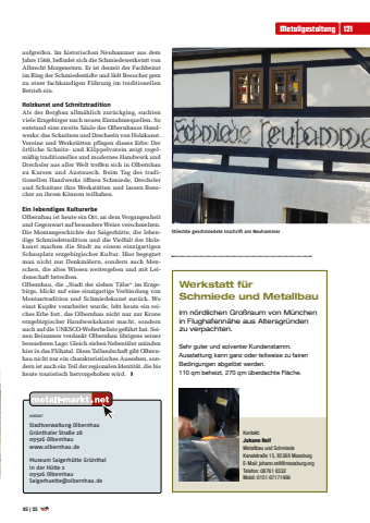 aufgreifen. Im historischen Neuhammer aus dem Jahre 1568, befindet sich die Schmiedewerkstatt von Albrecht Morgenstern. Er ist derzeit der Fachbeirat im Ring der Schmiedest%u00e4dte und l%u00e4dt Besucher gern zu einer fachkundigen F%u00fchrung im traditionellen Betrieb ein.Holzkunst und SchnitztraditionAls der Bergbau allm%u00e4hlich zur%u00fcckging, suchten viele Erzgebirger nach neuen Einnahmequellen. So entstand eine zweite S%u00e4ule des Olbernhauer Handwerks: das Schnitzen und Drechseln von Holzkunst. Vereine und Werkst%u00e4tten pflegen dieses Erbe: Der %u00f6rtliche Schnitz- und Kl%u00f6ppelverein zeigt regelm%u00e4%u00dfig traditionelles und modernes Handwerk und Drechsler aus aller Welt treffen sich in Olbernhau zu Kursen und Austausch. Beim Tag des traditionellen Handwerks %u00f6ffnen Schmiede, Drechsler und Schnitzer ihre Werkst%u00e4tten und lassen Besucher an ihrem K%u00f6nnen teilhaben.Ein lebendiges KulturerbeOlbernhau ist heute ein Ort, an dem Vergangenheit und Gegenwart auf besondere Weise verschmelzen. Die Montangeschichte der Saigerh%u00fctte, die lebendige Schmiedetradition und die Vielfalt der Holzkunst machen die Stadt zu einem einzigartigen Schauplatz erzgebirgischer Kultur. Hier begegnet man nicht nur Denkm%u00e4lern, sondern auch Menschen, die altes Wissen weitergeben und mit Leidenschaft betreiben.Olbernhau, die %u201eStadt der sieben T%u00e4ler%u201c im Erzgebirge, blickt auf eine einzigartige Verbindung von Montantradition und Schmiedekunst zur%u00fcck. Wo einst Kupfer verarbeitet wurde, lebt heute ein reiches Erbe fort, das Olbernhau nicht nur zur Krone erzgebirgischer Handwerkskunst macht, sondern auch auf die UNESCO-Welterbeliste gef%u00fchrt hat. Seinen Beinamen verdankt Olbernhau %u00fcbrigens seiner besonderen Lage: Gleich sieben Nebent%u00e4ler m%u00fcnden hier in das Fl%u00f6hatal. Diese Tallandschaft gibt Olbernhau nicht nur ein charakteristisches Aussehen, sondern ist auch ein Teil der regionalen Identit%u00e4t, die bis heute touristisch hervorgehoben wird. yStilechte geschmiedete Inschrift am NeuhammerMetallgestaltung 12105 | 25KONTAKTStadtverwaltung OlbernhauGr%u00fcnthaler Stra%u00dfe 2809526 Olbernhauwww.olbernhau.deMuseum Saigerh%u00fctte Gr%u00fcnthalIn der H%u00fctte 209526 OlbernhauSaigerhuette@olbernhau.deSehr guter und solventer Kundenstamm.Ausstattung kann ganz oder teilweise zu fairenBedingungen abgel%u00f6st werden.110 qm beheizt, 270 qm %u00fcberdachte Fl%u00e4che.Kontakt: Johann ReifMetallbau und SchmiedeKanalstra%u00dfe 15, 85368 MoosburgE-Mail: johann.reif@moosburg.orgTelefon: 08761 8332Mobil: 0151 67171996Werkstatt f%u00fcr Schmiede und Metallbauim n%u00f6rdlichen Gro%u00dfraum von M%u00fcnchen in Flughafenn%u00e4he aus Altersgr%u00fcnden zu verpachten.