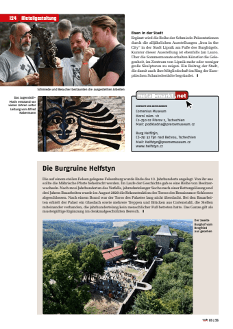 Die Burgruine HelfstynDie auf einem steilen Felsen gelegene Felsenburg wurde Ende des 13. Jahrhunderts angelegt. Von ihr aus sollte die M%u00e4hrische Pforte beherrscht werden. Im Laufe der Geschichte gab es eine Reihe von Besitzer,wechseln. Nach zwei Jahrhunderten des Verfalls, jahrzehntelanger Suche nach einer Rettungsl%u00f6sung und drei Jahren Bauarbeiten wurde im August 2020 die Rekonstruktion des Torsos des Renaissance-Schlosses abgeschlossen. Nach einem Brand war der Torso des Palastes lang nicht %u00fcberdacht. Bei den Bauarbeiten erhielt der Palast ein Glasdach sowie mehrere Treppen und Br%u00fccken aus Cortenstahl, die Stellen miteinander verbanden, die jahrhundertelang kein menschlicher Fu%u00df betreten hatte. Das Ganze gilt als musterg%u00fcltige Erg%u00e4nzung im denkmalgesch%u00fctzten Bereich. yDer zweite Burghof vom Bergfried aus gesehenEisen in der StadtErg%u00e4nzt wird die Reihe der Schmiede-Pr%u00e4sentationen durch die allj%u00e4hrlichen Ausstellungen %u201eIron in the City%u201c in der Stadt Lipnik am Fu%u00dfe des Burgh%u00fcgels. Kurator dieser Ausstellung ist ebenfalls Jan Lauro. %u00dcber die Sommermonate erhalten K%u00fcnstler die Gelegenheit, im Zentrum von Lipnik mehr oder weniger gro%u00dfe Skulpturen zu zeigen. Ein Beitrag der Stadt, die damit auch ihre Mitgliedschaft im Ring der Europ%u00e4ischen Schmiedest%u00e4dte begr%u00fcndet. ySchmiede und Besucher bestaunten die ausgestellten Arbeiten124 Metallgestaltung05|25KONTAKTE UND ANMELDUNGENComenius MuseumHorn%u00ed n%u00e1m. 1/1 Cz-750 02 P%u0159erov 2, TschechienMail: podkladna@prerovmuseum.czBurg Helf%u0161t%u00fdn, CZ-751 32 T%u00fdn nad Be%u010dvou, TschechienMail: Helfstyn@prerovmuseum.czwww.helfstyn.czDas JugendstilMotiv entstand vor vielen Jahren unter Leitung von Alfred Habermann