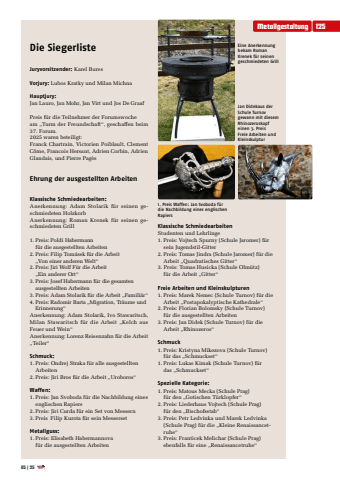 Eine Anerkennung bekam Roman Krenek fu%u0308r seinen geschmiedeten Grill1. Preis Waffen: Jan Svoboda fu%u0308r die Nachbildung eines englischen Rapiers Jan Didekaus der Schule Turnov gewann mit diesem Rhinozeroskopf einen 3. Preis Freie Arbeiten und KleinskulpturDie SiegerlisteJuryvorsitzender: Karel BuresVorjury: Lubos Kratky und Milan MichnaHauptjury: Jan Lauro, Jan Mohr, Jan Virt und Jos De GraafPreis f%u00fcr die Teilnehmer der Forumswocheam %u201eTurm der Freundschaft%u201c, geschaffen beim 37. Forum. 2025 waren beteiligt:Franck Chartrain, Victorien Poiblault, Clement C%u00f4me, Francois Hersant, Adrien Corbin, Adrien Glandais, und Pierre Pag%u00e8sEhrung der ausgestellten ArbeitenKlassische Schmiedearbeiten:Anerkennung: Adam Stolarik f%u00fcr seinen geschmiedeten HolzkorbAnerkennung: Roman Krenek f%u00fcr seinen geschmiedeten Grill 1. Preis: Poldi Habermann f%u00fcr die ausgestellten Arbeiten2. Preis: Filip Tom%u00e1sek f%u00fcr die Arbeit %u201eVon einer anderen Welt%u201c2. Preis: Jiri Wolf F%u00fcr die Arbeit %u201eEin anderer Ort%u201c3. Preis: Josef Habermann f%u00fcr die gesamten ausgestellten Arbeiten3. Preis: Adam Stolarik f%u00fcr die Arbeit %u201eFamili%u00e4r%u201c4. Preis: Radomir Barta %u201eMigration, Tr%u00e4ume und Erinnerung%u201cAnerkennung: Adam Stolarik, Ivo Stawaritsch, Milan Stawaritsch f%u00fcr die Arbeit %u201eKelch aus Feuer und Wein%u201cAnerkennung: Lorenz Reisenzahn f%u00fcr die Arbeit %u201eTeiler%u201cSchmuck:1. Preis: Ondrej Straka f%u00fcr alle ausgestellten Arbeiten2. Preis: Jiri Bros f%u00fcr die Arbeit %u201eUroboros%u201cWaffen:1. Preis: Jan Svoboda f%u00fcr die Nachbildung eines englischen Rapiers2. Preis: Jiri Curda f%u00fcr ein Set von Messern3. Preis Filip Kurota f%u00fcr sein MessersetMetallguss:1. Preis: Elisabeth Habermannova f%u00fcr die ausgestellten ArbeitenKlassische SchmiedearbeitenStudenten und Lehrlinge1. Preis: Vojtech Spurny (Schule Jaromer) f%u00fcr sein Jugendstil-Gitter2. Preis: Tomas Jindra (Schule Jaromer) f%u00fcr die Arbeit %u201eQuadratisches Gitter%u201c3. Preis: Tomas Husicka (Schule Olm%u00fctz) f%u00fcr die Arbeit %u201eGitter%u201cFreie Arbeiten und Kleinskulpturen1. Preis: Marek Nemec (Schule Turnov) f%u00fcr die Arbeit %u201ePostapokalyptische Kathedrale%u201c2. Preis: Florian Bolomsky (Schule Turnov) f%u00fcr die ausgestellten Arbeiten3. Preis: Jan Didek (Schule Turnov) f%u00fcr die Arbeit %u201eRhinozeros%u201cSchmuck1. Preis: Kristyna Mikezova (Schule Turnov) f%u00fcr das %u201eSchmuckset%u201c1. Preis: Lukas Kimak (Schule Turnov) f%u00fcr das %u201eSchmuckset%u201cSpezielle Kategorie:1. Preis: Matous Mecka (Schule Prag) f%u00fcr den %u201eGotischen T%u00fcrklopfer%u201c2. Preis: Liederhaus Vojtech (Schule Prag) f%u00fcr den %u201eBischofsstab%u201c3. Preis: Petr Ledvinka und Marek Ledvinka (Schule Prag) f%u00fcr die %u201eKleine Renaissancetruhe%u201c3. Preis: Franticek Melichar (Schule Prag) ebenfalls f%u00fcr eine %u201eRenaissancetruhe%u201cMetallgestaltung 12505 | 25