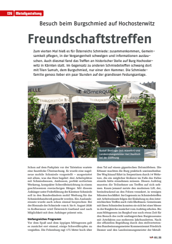 126 Metallgestaltung05|25Besuch beim Burgschmied auf HochosterwitzFreundschaftstreffenZum vierten Mal hie%u00df es f%u00fcr %u00d6sterreichs Schmiede: zusammenkommen, Gemeinsamkeit pflegen, in der Vergangenheit schwelgen und Informationen austauschen. Auch diesmal fand das Treffen an historischer Stelle auf Burg Hochosterwitz in K%u00e4rnten statt. Im Gegensatz zu anderen Schmiedetreffen schwang dort mit Tilen Sumah, dem Burgschmied, nur einer den Hammer. Die Schmiedefamilie genoss lieber ein paar Stunden auf der grandiosen Festungsanlage.Schon auf dem Parkplatz vor der Talstation wartete eine faustdicke %u00dcberraschung. Es wurde eine nagelneue mobile Schmiede vorgestellt %u2013 ausgestattet mit allem, was das Herz begehrt: drei Arbeitspl%u00e4tze mit Schmiedeessen, Ambossen, perfekt sortiertem Werkzeug, kompakter Schwei%u00dfeinrichtung in einem geschlossenen zweiachsigen H%u00e4nger. Mit diesem Anh%u00e4nger unter Federf%u00fchrung der K%u00e4rntner Schmiede soll in den Bundesl%u00e4ndern mobil Werbung f%u00fcr das Schmiedehandwerk gemacht werden. Ein Auslandseinsatz wurde auch schon einmal besprochen: Bei der Biennale der Schmiede vom 6. bis 9. August 2026 in Kolbermoor wird %u00d6sterreich Gastland und nach M%u00f6glichkeit mit dem Anh%u00e4nger pr%u00e4sent sein.Umfangreiches ProgrammVor dem Spa%u00df und dem %u00fcppigen Mittagessen galt es zun%u00e4chst erst einmal, einige Schwei%u00dftropfen zu vergie%u00dfen. Die Felsenburg ragt 175 Meter hoch %u00fcber dem Tal auf einem gigantischen Dolomitfelsen. Die Erbauer machten die Burg praktisch uneinnehmbar. Der Weg hinauf f%u00fchrt in Serpentinen durch 14 Wehrtore, die ein m%u00f6glicher Eroberer im Falle des Falles einzeln h%u00e4tte einnehmen m%u00fcssen. Diesen Aufstieg mussten die Teilnehmer am Treffen auf sich nehmen. Kaum jemand nutzte den modernen Lift, der, beeindruckend an den Felsen verankert, in wenigen Minuten hochf%u00e4hrt. Im Gegensatz zu Schmiedetreffen mit Arbeitseinsatz folgen der Einladung zu den %u00f6sterreichischen Treffen auch viele Ehefrauen. Gemeinsam mit ihren Schmieden konnten sie sich bei einer Messe in der Burgkirche zun%u00e4chst vom Aufstieg erholen. Bis zum Mittagessen im Burghof war noch etwas Zeit f%u00fcr den Besuch des recht umfangreichen Burgmuseums mit Artefakten aus mehreren Jahrhunderten. Nach der offiziellen Begr%u00fc%u00dfung durch den stellvertretenden Bundesinnungsmeister Kommerzienrat Friedrich Danner und den Landesinnungsmeister der MetallRudolf %u00d6hnlinger (mit Mikrofon) und Landesinnungsmeister Karl Paulitsch bei der Er%u00f6ffnung Fotos: Peter Elga%u00df