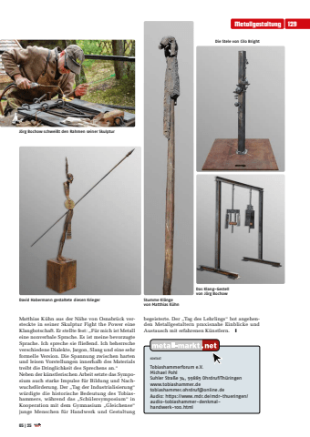 Das Klang-Gestell von J%u00f6rg BochowDavid Habermann gestaltete diesen Krieger Stumme Kl%u00e4nge von Matthias K%u00fchnDie Stele von Cilo BrightMetallgestaltung 12905 | 25KONTAKTTobiashammerforum e.V.Michael PohlSuhler Stra%u00dfe 34, 99885 Ohrdruf/Th%u00fcringenwww.tobiashammer.detobiashammer.ohrdruf@online.deAudio: https://www.mdr.de/mdr-thueringen/audio-tobiashammer-denkmalhandwerk-100.htmlMatthias K%u00fchn aus der N%u00e4he von Osnabr%u00fcck versteckte in seiner Skulptur Fight the Power eine Klangbotschaft. Er stellte fest: %u201eF%u00fcr mich ist Metall eine nonverbale Sprache. Es ist meine bevorzugte Sprache. Ich spreche sie flie%u00dfend. Ich beherrsche verschiedene Dialekte, Jargon, Slang und eine sehr formelle Version. Die Spannung zwischen harten und leisen Vorstellungen innerhalb des Materials treibt die Dringlichkeit des Sprechens an.%u201cNeben der k%u00fcnstlerischen Arbeit setzte das Symposium auch starke Impulse f%u00fcr Bildung und Nachwuchsf%u00f6rderung. Der %u201eTag der Industrialisierung%u201c w%u00fcrdigte die historische Bedeutung des Tobiashammers, w%u00e4hrend das %u201eSch%u00fclersymposium%u201c in Kooperation mit dem Gymnasium %u201eGleichense%u201c junge Menschen f%u00fcr Handwerk und Gestaltung J%u00f6rg Bochow schwei%u00dft den Rahmen seiner Skulpturbegeisterte. Der %u201eTag des Lehrlings%u201c bot angehenden Metallgestaltern praxisnahe Einblicke und Austausch mit erfahrenen K%u00fcnstlern. y