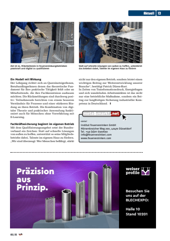 Ein Modell mit WirkungDer Lehrgang richtet sich an QuereinsteigerInnen, Berufsanf%u00e4ngerInnen denen das theoretische Fundament f%u00fcr ihre praktische T%u00e4tigkeit fehlt oder an Mitarbeitende, die ihre Fachkenntnisse ausbauen m%u00f6chten. Die R%u00fcckmeldungen sind durchweg positiv: Teilnehmende berichten von einem besseren Verst%u00e4ndnis f%u00fcr Prozesse und einer st%u00e4rkeren Bindung an ihren Betrieb. Die Kombination von digitaler Theorie und praktischer Anwendung funktioniert auch f%u00fcr Menschen ohne Vorerfahrung mit E-Learning.Fachkr%u00e4ftesicherung beginnt im eigenen BetriebMit dem Qualifizierungsangebot setzt der Bundesverband ein Zeichen: Statt auf schnelle L%u00f6sungen von au%u00dfen zu hoffen, unterst%u00fctzt es seine Mitgliedsbetriebe dabei, Talente im eigenen Haus zu f%u00f6rdern. %u201eWir sind %u00fcberzeugt: Wer Menschen bef%u00e4higt, st%u00e4rkt Ziel ist es, Mitarbeitende in Feuerverzinkungsbetrieben praxisnah und digital zu qualifizierenStatt auf schnelle L%u00f6sungen von au%u00dfen zu hoffen, unterst%u00fctzt das Anbebot dabei, Talente im eigenen Haus zu f%u00f6rdernnicht nur den eigenen Betrieb, sondern leistet einen wichtigen Beitrag zur Weiterentwicklung unserer Branche%u201c, best%u00e4tigt Patrick D%u00fcren-Rost.In Zeiten von Transformationsdruck, Energiefragen und sich wandelnden Arbeitsm%u00e4rkten ist das nicht nur eine betriebliche Ma%u00dfnahme, sondern ein Beitrag zur langfristigen Sicherung industrieller Kompetenz in Deutschland. yPr%u00e4zisionausPrinzip. Besuchen Sie uns auf der BLECHEXPO: Halle 10Stand 10201KONTAKTInstitut Feuerverzinken GmbHM%u00f6rsenbroicher Weg 200, 40470 D%u00fcsseldorfTel. +49 (0)211 6907650info@feuerverzinken.comwww.feuerverzinken.comAktuell 1305| 25