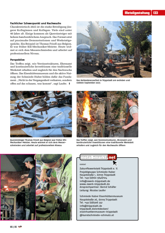 Metallgestaltung 13305 | 25KONTAKTZukunftswerkstatt Trippstadt e. V. Projektgruppe Schmiede HuberHauptstra%u00dfe 1, 67705 Trippstadt Tel. +49 (0)160 97467124 info@zwerk-trippstadt.de www.zwerk-trippstadt.de Ansprechpartner: Bernd Sch%u00e4ferLeitung: Nicolas LauferSchmiede Huber Eisenh%u00fcttenmuseumHauptstra%u00dfe 26, 67705 TrippstadtTel. +49 (0)6306 341info@trippstadt.detrippstadt.de/entdecken/eisenhuettenmuseum-trippstadt@kunstschmiede-schmutz.atFachlicher Schwerpunkt und NachwuchsCharakteristisch 2025 ist die starke Beteiligung j%u00fcngerer Kolleginnen und Kollegen. Viele sind unter 40 Jahre alt. Einige kommen als Quereinsteiger mit hohem handwerklichem Anspruch. Das Format setzt auf praxisnahe Demonstrationen und Werkstattgespr%u00e4che. Ein Beispiel ist Thomas Friedl aus Belgien. Er war fr%u00fcher Kfz-Mechaniker-Meister. Heute widmet er sich dem Messerschmieden und arbeitet auf professionellem Niveau.PerspektiveDas Treffen zeigt, wie Vereinsstrukturen, Ehrenamt und kontinuierliche Investitionen eine traditionelle Werkstatt erhalten und zugleich f%u00fcr den Nachwuchs %u00f6ffnen. Das Eisenh%u00fcttenmuseum und die aktive Nutzung der Schmiede Huber bilden daf%u00fcr das Fundament. %u201eNicht in der Vergangenheit verharren, sondern offen auf das schauen, was kommt%u201c, sagt Laufer. yDas Kohlenbrennerfest in Trippstadt am sechsten und siebten September 2025Quereinsteiger Thomas Friedl aus Belgien war fr%u00fcher KfzMechaniker-Meister. Heute widmet er sich dem Messerschmieden und arbeitet auf professionellem NiveauDas Treffen zeigt, wie Vereinsstrukturen, Ehrenamt und kontinuierliche Investitionen eine traditionelle Werkstatt erhalten und zugleich f%u00fcr den Nachwuchs %u00f6ffnen