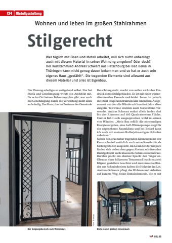134 Metallgestaltung05|25Wohnen und leben im gro%u00dfen StahlrahmenStilgerechtWer t%u00e4glich mit Eisen und Metall arbeitet, will sich nicht unbedingt auch mit diesem Material in seiner Wohnung umgeben? Oder doch? Der Kunstschmied Andreas Schwarz aus Hetschburg bei Bad Berka in Th%u00fcringen kann nicht genug davon bekommen und so hat er auch sein eigenes Haus %u201egest%u00e4hlt%u201c. Die tragenden Elemente sind allesamt aus diesem Material und alles ist Eigenbau.Die Planung erledigte er weitgehend selbst. Nur bei Statik und Genehmigung wirkte ein Architekt mit. Da es im Ort keinen Bebauungsplan gibt, war auch die Genehmigung durch die Verwaltung nicht allzu aufw%u00e4ndig. Das Haus, das im Zentrum der Gemeinde Hetschburg steht, macht von au%u00dfen nicht den Eindruck eines Stahlgeb%u00e4udes. Es ist mit einer w%u00e4rmed%u00e4mmenden Fassade verkleidet. Innen ist jedoch die Stahl-Tr%u00e4gerkonstruktion klar erkennbar. Ausgemauert wurden die W%u00e4nde mit hundert Jahre alten Ziegeln. Teilweise wurden auch Natursteine verwendet. Andras Schwarz wohnt allein in den drei bis vier Zimmern auf 105 Quadratmetern Fl%u00e4che. Und er f%u00fchlt sich ausgesprochen wohl in seinen vier W%u00e4nden: %u201eMein Bau erf%u00fcllt die notwendigen Energievorgaben, eine Luft-W%u00e4rmepumpe sorgt f%u00fcr ein angenehmes Raumklima und bei Bedarf kann ich noch mit meinem Bullerjahn-artigen Holzofen zuheizen.%u201cNeben den erkennbar tragenden Elementen hat der Kunstschmied nat%u00fcrlich auch seine Kreativit%u00e4t als Metallgestalter ausgelebt. Im Gel%u00e4nder der Empore finden sich neben dem gegen Absturz sch%u00fctzenden Drahtgeflecht auch klassische Schmiedeschn%u00f6rkel. Dar%u00fcber pocht ein eherner Specht den Tr%u00e4ger an. Oben an einer h%u00f6lzernen Trennwand leuchten zwei filigran gestaltete Leuchter und zwei massive B%u00e4nder aus Schmiedeeisen halten die Holzt%u00fcre im Lot. Andreas Schwarz pflegt das Wohnen und Arbeiten auf kurzem Weg. Seine Ilmtalschmiede, die er mit Der Eingangsbereich zum WohnhausFotos: SchwarzBlick in den gro%u00dfen Innenraum