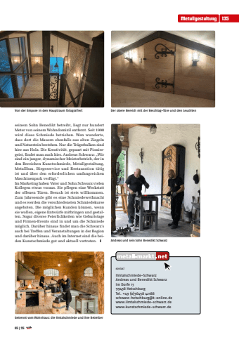 Metallgestaltung 13505 | 25seinem Sohn Benedikt betreibt, liegt nur hundert Meter von seinem Wohndomizil entfernt. Seit 1990 wird diese Schmiede betrieben. Wen wunderts, dass dort die Mauern ebenfalls aus alten Ziegeln und Naturstein bestehen. Nur die Tr%u00e4gerbalken sind hier aus Holz. Die Kreativit%u00e4t, gepaart mit Pioniergeist, findet man auch hier. Andreas Schwarz: %u201eWir sind ein junger, dynamischer Meisterbetrieb, der in den Bereichen Kunstschmiede, Metallgestaltung, Metallbau, Biegeservice und Restauration t%u00e4tig ist und %u00fcber den erforderlichen umfangreichen Maschinenpark verf%u00fcgt.%u201cIm Marketing haben Vater und Sohn Schwarz vielen Kollegen etwas voraus. Sie pflegen eine Werkstatt der offenen T%u00fcren. Besuch ist stets willkommen. Zum Jahresende gibt es eine Schmiedeweihnacht und es werden die verschiedensten Schmiedekurse angeboten. Die m%u00f6glichen Kunden k%u00f6nnen, wenn sie wollen, eigene Entw%u00fcrfe mitbringen und gestalten. Sogar diverse Feierlichkeiten wie Geburtstage und Firmen-Events sind in und um die Schmiede m%u00f6glich. Dar%u00fcber hinaus findet man die Schwarz%u2019s auch bei Treffen und Veranstaltungen in der Region und dar%u00fcber hinaus. Auch im Internet sind die beiden Kunstschmiede gut und aktuell vertreten. yKONTAKTIlmtalschmiede-SchwarzAndreas und Benedikt SchwarzIm Dorfe 1399438 HetschburgTel. +49 (0)36458 42188schwarz-hetschburg@t-online.dewww.ilmtalschmiede-schwarz.dewww.kunstschmiede-schwarz.deGetrennt vom Wohnhaus: die Ilmtalschmiede und ihre BetreiberAndreas und sein Sohn Benedikt SchwarzVon der Empore in den Hauptraum fotografiert Der obere Bereich mit der Beschlag-T%u00fcre und den Leuchten