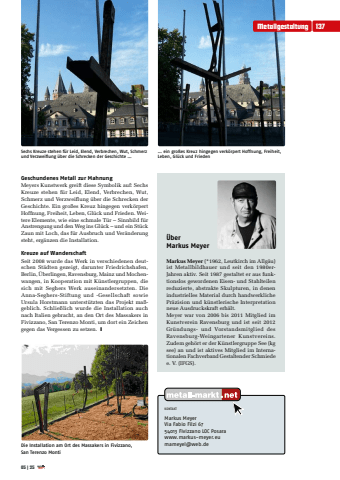 Geschundenes Metall zur MahnungMeyers Kunstwerk greift diese Symbolik auf: Sechs Kreuze stehen f%u00fcr Leid, Elend, Verbrechen, Wut, Schmerz und Verzweiflung %u00fcber die Schrecken der Geschichte. Ein gro%u00dfes Kreuz hingegen verk%u00f6rpert Hoffnung, Freiheit, Leben, Gl%u00fcck und Frieden. Weitere Elemente, wie eine schmale T%u00fcr %u2013 Sinnbild f%u00fcr Anstrengung und den Weg ins Gl%u00fcck %u2013 und ein St%u00fcck Zaun mit Loch, das f%u00fcr Ausbruch und Ver%u00e4nderung steht, erg%u00e4nzen die Installation.Kreuze auf WanderschaftSeit 2008 wurde das Werk in verschiedenen deutschen St%u00e4dten gezeigt, darunter Friedrichshafen, Berlin, %u00dcberlingen, Ravensburg, Mainz und Mochenwangen, in Kooperation mit K%u00fcnstlergruppen, die sich mit Seghers Werk auseinandersetzten. Die Anna-Seghers-Stiftung und -Gesellschaft sowie Ursula Horstmann unterst%u00fctzten das Projekt ma%u00dfgeblich. Schlie%u00dflich wurde die Installation auch nach Italien gebracht, an den Ort des Massakers in Fivizzano, San Terenzo Monti, um dort ein Zeichen gegen das Vergessen zu setzen. yDie Installation am Ort des Massakers in Fivizzano, San Terenzo MontiMetallgestaltung 13705 | 25Sechs Kreuze stehen f%u00fcr Leid, Elend, Verbrechen, Wut, Schmerz und Verzweiflung %u00fcber die Schrecken der Geschichte %u2026%u2026 ein gro%u00dfes Kreuz hingegen verk%u00f6rpert Hoffnung, Freiheit, Leben, Gl%u00fcck und Frieden%u00dcberMarkus MeyerMarkus Meyer (*1962, Leutkirch im Allg%u00e4u) ist Metallbildhauer und seit den 1980erJahren aktiv. Seit 1987 gestaltet er aus funktionslos gewordenen Eisen- und Stahlteilen reduzierte, abstrakte Skulpturen, in denen industrielles Material durch handwerkliche Pr%u00e4zision und k%u00fcnstlerische Interpretation neue Ausdruckskraft erh%u00e4lt.Meyer war von 2006 bis 2011 Mitglied im Kunstverein Ravensburg und ist seit 2012 Gr%u00fcndungs- und Vorstandsmitglied des Ravensburg-Weingartener Kunstvereins. Zudem geh%u00f6rt er der K%u00fcnstlergruppe See (kg see) an und ist aktives Mitglied im Internationalen Fachverband Gestaltender Schmiede e. V. (IFGS).KONTAKTMarkus MeyerVia Fabio Filzi 6754013 Fivizzano LOC Posarawww.markus-meyer.eu mameyel@web.de