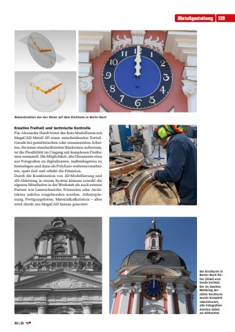 Kreative Freiheit und technische KontrolleF%u00fcr Alexander Hardt bietet das freie Modellieren mit MegaCAD Metall 3D einen entscheidenden Vorteil. Gerade bei gestalterischen oder ornamentalen Arbeiten, die keine standardisierten Bauformen aufweisen, ist die Flexibilit%u00e4t im Umgang mit komplexen Freiformen essenziell. Die M%u00f6glichkeit, alte Ornamente etwa aus Fotografien zu digitalisieren, ma%u00dfstabsgetreu zu hinterlegen und dann als Polylinie weiterzuverarbeiten, spart Zeit und erh%u00f6ht die Pr%u00e4zision.Durch die Kombination von 3D-Modellierung und 2D-Ableitung in einem System k%u00f6nnen sowohl die eigenen Mitarbeiter in der Werkstatt als auch externe Partner wie Laserschneider, Fr%u00e4sereien oder Architekten nahtlos eingebunden werden. Arbeitsplanung, Fertigungslisten, Materialkalkulation %u2013 alles wird direkt aus MegaCAD heraus generiert.Rekonstruktion der vier Uhren auf dem Kirchturm in Berlin-BuchDer Kirchturm in Berlin-Buch fr%u00fcher (links) und heute (rechts): Der im Zweiten Weltkrieg zerst%u00f6rte Kirchturm wurde komplett rekonstruiert, alte Fotografien dienten dabei als HilfsmittelMetallgestaltung 13905 | 25