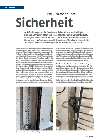 BVT %u2013 Verband ToreSicherheitDie Anforderungen an die funktionale Sicherheit von kraftbet%u00e4tigten Toren und Schranken haben sich in den letzten Jahren weiterentwickelt. Die Ausgabe 11/2017 der DIN EN 12453 %u201eTore %u2013 Nutzungssicherheit kraftbet%u00e4tigter Tore %u2013 Anforderungen und Pr%u00fcfverfahren%u201c beschreibt in Abschnitt 5.1.2 die normativen Anforderungen an die funktionale Sicherheit.Steuerungen von kraftbet%u00e4tigten Toranlagen m%u00fcssen demnach in der Lage sein, Fehler in sicherheitsrelevanten Teilen der Steuerung zu erkennen und die Anlage in einen sicheren Zustand zu %u00fcberf%u00fchren %u2013 etwa durch ein Stoppen oder Nicht-Wiederanlaufen des Tores. Damit greifen die Vorgaben der DIN EN 12453 auf zentrale Prinzipien der Normenreihe ISO 13849 zur%u00fcck, die Anforderungen an sicherheitsbezogene Teile von Maschinensteuerungen beschreibt.Die %u00fcberarbeitete DIN EN 12453:2022-08 pr%u00e4zisiert den Umgang mit sicherheitsrelevanten Schaltkreisen: Sicherheitsschalter selbst brauchen nicht %u00fcberwacht oder getestet zu werden, sofern, wie vorgeschrieben, bew%u00e4hrte Bauteile beziehungsweise zwangstrennende Schalter verwendet werden. Gleiches gilt f%u00fcr fest und gesch%u00fctzt verlegte Leitungen (wie in Installationsrohren oder Kabelkan%u00e4len). Anders ist dieses bei ungesch%u00fctzten oder beweglichen Leitungen %u2013 etwa Spiralkabeln oder Schleppketten. Hier besteht bei nicht %u00fcberwachten Leitungen ein erh%u00f6htes Risiko aufgrund potenzieller Querschl%u00fcsse (zum Beispiel wegen Besch%u00e4digung oder Verknotung, siehe Fotos), sodass geeignete Ma%u00dfnahmen wie eine regelm%u00e4%u00dfige Sichtpr%u00fcfung oder ein vorbeugender Austausch empfohlen werden.Was bedeutet das f%u00fcr bestehende Toranlagen?Sachkundige und Fachbetriebe stehen bei der Pr%u00fcfung %u00e4lterer Anlagen vor der Herausforderung, dass viele dieser Anlagen die aktuellen Anforderungen an die funktionale Sicherheit nicht erf%u00fcllen %u2013 schlicht, weil diese Anforderungen zum Zeitpunkt der Inverkehrbringung noch nicht Bestandteil der Tor-Normen waren. Eine messtechnische Pr%u00fcfung auf funktionale Sicherheit ist in der Regel nicht m%u00f6glich. Vielmehr ist die Dokumentation des Herstellers ausschlag%u00dcberstrecktes Spiralkabel mit besch%u00e4digtem Mantel Verknotetes SpiralkabelFotos: BVT %u2013 Verband Tore05|2514 Aktuell