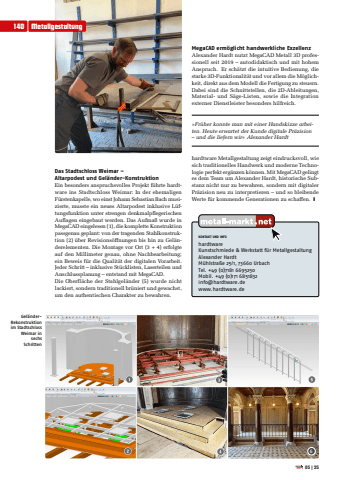 MegaCAD erm%u00f6glicht handwerkliche Exzellenz Alexander Hardt nutzt MegaCAD Metall 3D professionell seit 2019 %u2013 autodidaktisch und mit hohem Anspruch. Er sch%u00e4tzt die intuitive Bedienung, die starke 3D-Funktionalit%u00e4t und vor allem die M%u00f6glichkeit, direkt aus dem Modell die Fertigung zu steuern. Dabei sind die Schnittstellen, die 2D-Ableitungen, Material- und S%u00e4ge-Listen, sowie die Integration externer Dienstleister besonders hilfreich. %u00bbFr%u00fcher konnte man mit einer Handskizze arbeiten. Heute erwartet der Kunde digitale Pr%u00e4zision %u2013 und die liefern wir%u00ab Alexander Hardthardtware Metallgestaltung zeigt eindrucksvoll, wie sich traditionelles Handwerk und moderne Technologie perfekt erg%u00e4nzen k%u00f6nnen. Mit MegaCAD gelingt es dem Team um Alexander Hardt, historische Substanz nicht nur zu bewahren, sondern mit digitaler Pr%u00e4zision neu zu interpretieren %u2013 und so bleibende Werte f%u00fcr kommende Generationen zu schaffen. yGel%u00e4nderRekonstruktion im Stadtschloss Weimar in sechs SchrittenDas Stadtschloss Weimar %u2013 Altarpodest und Gel%u00e4nder-KonstruktionEin besonders anspruchsvolles Projekt f%u00fchrte hardtware ins Stadtschloss Weimar: In der ehemaligen F%u00fcrstenkapelle, wo einst Johann Sebastian Bach musizierte, musste ein neues Altarpodest inklusive L%u00fcftungsfunktion unter strengen denkmalpflegerischen Auflagen eingebaut werden. Das Aufma%u00df wurde in MegaCAD eingelesen (1), die komplette Konstruktion passgenau geplant: von der tragenden Stahlkonstruktion (2) %u00fcber Revisions%u00f6ffnungen bis hin zu Gel%u00e4nderelementen. Die Montage vor Ort (3 + 4) erfolgte auf den Millimeter genau, ohne Nachbearbeitung; ein Beweis f%u00fcr die Qualit%u00e4t der digitalen Vorarbeit. Jeder Schritt %u2013 inklusive St%u00fccklisten, Laserteilen und Anschlussplanung %u2013 entstand mit MegaCAD. Die Oberfl%u00e4che der Stahlgel%u00e4nder (5) wurde nicht lackiert, sondern traditionell br%u00fcniert und gewachst, um den authentischen Charakter zu bewahren.6140 Metallgestaltung05|25KONTAKT UND INFOhardtwareKunstschmiede & Werkstatt f%u00fcr Metallgestaltung Alexander Hardt M%u00fchlstra%u00dfe 25/1, 73660 UrbachTel. +49 (0)7181 6695250 Mobil. +49 (0)171 6851832 info@hardtware.dewww.hardtware.de