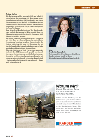 Antrag stellenDie Entlastung erfolgt ausschlie%u00dflich auf schriftlichen Antrag. Voraussetzung ist, dass der zu erstattende Betrag mindestens 250 Euro betr%u00e4gt, was einem Stromverbrauch von j%u00e4hrlich 12.500 Kilowattstunden entspricht. Die entsprechenden Antragsformulare stehen im Zollportal (https://www.zoll-portal.de/) zur Verf%u00fcgung.Laut aktuellem Haushaltsentwurf der Bundesregierung soll die Entlastung in H%u00f6he von 20 Euro pro Megawattstunde auch %u00fcber den 31. Dezember 2025 hinaus fortgef%u00fchrt werden.Bei einer voraussichtlichen Entlastung von mehr als 1000 Euro pro Quartal kann eine unterj%u00e4hrige Auszahlung beantragt werden. Ansonsten ist der Antrag sp%u00e4testens bis zum 31. Dezember des auf das Verbrauchsjahr folgenden Kalenderjahres beim zust%u00e4ndigen Hauptzollamt einzureichen.%u00dcber die Plattform %u201ee-Tool%u201c (https://www.energietool.de/) des ZDH kann vorab gepr%u00fcft werden, ob das eigene Unternehmen grunds%u00e4tzlich entlastungsberechtigt ist. Die erstmalige Antragstellung ist mit einem gewissen Aufwand verbunden, kann jedoch %u2013 insbesondere bei hohem Stromverbrauch %u2013 finanziell lohnend sein. yInfo:Friederike TanzeglockRechtsanw%u00e4ltin (Syndikusanw%u00e4ltin) beim Bundesverband Metall in Essen friederike.tanzeglock@metallhandwerk.deSchon unsere Beratung bei der Konstruktion spart Kosten und steigert die Qualit%u00e4t. Und Sie profitieren von 240 kompetenten Mitarbeitern an f%u00fcnf Standorten im S%u00fcden. Oder auch dort, wo Sie sich aufhalten. Mehr Infos unter www.karger.net oder 07303 161-100. Damit Sie sich in Ruhe um Ihre Gesch%u00e4fte k%u00fcmmern k%u00f6nnen.Warum wir?KARGERGut verzinkt. Gut beschichtet. Gut drauf.05| 25Netzwerk 147