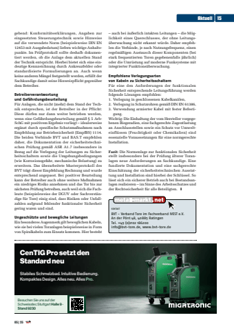 gebend: Konformit%u00e4tserkl%u00e4rungen, Angaben zur eingesetzten Steuerungstechnik sowie Hinweise auf die verwendete Norm (beispielsweise DIN EN 12453 mit Ausgabedatum) liefern wichtige Anhaltspunkte. Im Pr%u00fcfprotokoll sollte deshalb dokumentiert werden, ob die Anlage dem aktuellen Stand der Technik entspricht. Hierbei bietet sich eine eindeutige Kennzeichnung durch Ankreuzfelder oder standardisierte Formulierungen an. Auch wenn keine anderen M%u00e4ngel festgestellt werden, erf%u00fcllt der Sachkundige damit seine Hinweispflicht gegen%u00fcber dem Betreiber.Betreiberverantwortung und Gef%u00e4hrdungsbeurteilungF%u00fcr Anlagen, die nicht (mehr) dem Stand der Technik entsprechen, ist der Betreiber in der Pflicht: Diese d%u00fcrfen nur dann weiter betrieben werden, wenn eine Gef%u00e4hrdungsbeurteilung gem%u00e4%u00df %u00a7 5 ArbSchG mit positivem Ergebnis vorliegt %u2013 idealerweise erg%u00e4nzt durch spezifische Schutzma%u00dfnahmen nach Empfehlung zur Betriebssicherheit (EmpfBS) 1114. Die beiden Verb%u00e4nde BVT und BAS.T empfehlen daher, die Dokumentation der sicherheitstechnischen Pr%u00fcfung gem%u00e4%u00df ASR A1.7 insbesondere in Bezug auf die Verlegung der Leitungen zu Sicherheitsschaltern sowie die Umgebungsbedingungen (wie Korrosionsgefahr, mechanische Belastung) zu erweitern. Das %u00fcberarbeitete Musterprotokoll des BVT tr%u00e4gt dieser Empfehlung Rechnung und wurde entsprechend angepasst. Bei positiver Beurteilung kann der Betreiber auch ohne weitere Ma%u00dfnahmen ein niedriges Risiko annehmen und das Tor bis zur n%u00e4chsten Pr%u00fcfung betreiben, auch weil sich die Fachleute (beispielsweise der DGUV oder Sachverst%u00e4ndige f%u00fcr Tore) einig sind, dass Risiken oder Unfallzahlen aufgrund fehlender funktionaler Sicherheit gering waren und sind.Ungesch%u00fctzte und bewegliche LeitungenEin besonderes Augenmerk gilt beweglichen Kabeln, wie sie bei vielen Toranlagen beispielsweise in Form von Spiralkabeln zum Einsatz kommen. Hier besteht %u2013 auch bei %u00e4u%u00dferlich intakten Leitungen %u2013 die M%u00f6glichkeit eines Querschlusses, der ohne Leitungs%u00fcberwachung nicht erkannt w%u00fcrde. Daher empfehlen die Verb%u00e4nde, je nach Nutzungsfrequenz, einen regelm%u00e4%u00dfigen Austausch dieser Komponenten (bei stark frequentierten Toren gegebenenfalls j%u00e4hrlich) oder die Umr%u00fcstung auf moderne Funksysteme mit integrierter Funktions%u00fcberwachung.Empfohlene Verlegungsarten von Kabeln zu SicherheitsschalternF%u00fcr eine den Anforderungen der funktionalen Sicherheit entsprechende Leitungsf%u00fchrung werden folgende L%u00f6sungen empfohlen:1. Verlegung in geschlossenen Kabelkan%u00e4len,2. Verlegung in Schutzrohren gem%u00e4%u00df DIN EN 61386,3. Verwendung armierter Kabel mit fester Befestigung.Wichtig: Die Einhaltung der vom Hersteller vorgegebenen Biegeradien, eine fachgerechte Zugentlastung an Anschlussstellen sowie ein Schutz vor Umwelteinfl%u00fcssen (Feuchtigkeit oder Chemikalien) sind essenzielle Voraussetzungen f%u00fcr eine normgerechte Installation.Fazit: Die Normenlage zur funktionalen Sicherheit stellt insbesondere bei der Pr%u00fcfung %u00e4lterer Toranlagen neue Anforderungen an Sachkundige. Eine fundierte Dokumentation und eine sachgerechte Einsch%u00e4tzung der sicherheitstechnischen Ausstattung und Installation sind hierbei der Schl%u00fcssel. So l%u00e4sst sich ein sicherer Betrieb auch bei Bestandsanlagen realisieren %u2013 im Sinne des Arbeitsschutzes und der Rechtssicherheit f%u00fcr alle Beteiligten. yStabiles Schmelzbad. Intuitive Bedienung.Kompaktes Design. Alles neu. Alles Pro.CenTIG Pro setzt den Standard neuBesuchen Sie uns auf der Schweisstec Stuttgart Halle 9 %u00b7 Stand 9230KONTAKTBVT - Verband Tore im Fachverband IVEST e.V. An der P%u00f6nt 48, 40885 RatingenTel. +49 (0)2102 186200info@bvt-tore.de, www.bvt-tore.deAktuell 1505| 25