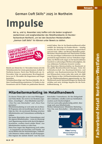 Fachverband Metall Nordrhein-WestfalenGerman Craft Skills%u201c 2025 in NortheimImpulseAm 14. und 15. November 2025 treffen sich die besten Junghandwerkerinnen und Junghandwerker des Metallhandwerks im Bundesfachzentrum Northeim, um bei den Deutschen Meisterschaften %u201eGerman Craft Skills%u201c ihr K%u00f6nnen unter Beweis zu stellen.Bereits am Abend des 13. November lernen sich die Teilnehmenden bei einem gemeinsamen Auftakt in Northeim kennen. Nach dem Wettbewerb am 14. November folgt ein gemeinsamer Bowlingabend, bevor am 15. November die Siegerinnen und Sieger feststehen.Teilnahmeberechtigt sind Nachwuchskr%u00e4fte, die in ihrer Gesellenpr%u00fcfung mindestens 74 Punkte in der Gesamtnote und 81 Punkte im praktischen Bereich Zu diesem Thema gibt es eine neue Whitepaperund Video-Reihe. Sie wird in vier Modulen angeboten: %u201eGrundlagen%u201c, %u201eVom Mitarbeiter zum Fan%u201c, %u201eVom Fan zum Botschafter%u201c und %u201eNeue Fans gewinnen%u201c.Mitarbeitermarketing ist weit mehr als ein Benefit-Programm oder ein kurzfristiger Impuls. Es verfolgt das Ziel, die emotionale Bindung zwischen Mitarbeitenden und Unternehmen nachhaltig zu st%u00e4rken. Die besten Botschafter eines Unternehmens sind die eigenen Mitarbeitenden %u2013 wenn sie %u00fcberzeugt sind. Begeisterung w%u00e4chst nicht durch Hochglanzbrosch%u00fcren, sondern durch erlebte Werte. Aus Mitarbeitenden werden so echte Fans.Diese Fans tragen ihre Begeisterung nach au%u00dfen %u2013 in Gespr%u00e4chen mit Freunden und Familie, auf Social Media oder bei Veranstaltungen. Authentische Stimmen wirken st%u00e4rker als jede Kampagne. Hier beginnt der n%u00e4chste Schritt: vom Fan zum Botschafter. Unternehmen, die ihre Belegschaft aktiv einbinden, schaffen nicht nur Sichtbarkeit, sondern auch Glaubw%u00fcrdigkeit.Und wer nach au%u00dfen glaubw%u00fcrdig auftritt, %u00fcberzeugt auch neue Mitarbeitende. Weitere Informationen: Mitarbeiter Marketing %u2013 Vom Fan zum Botschafter %u2013 Metallhandwerk NRWerzielt haben. Neu ist: Im Bundeswettbewerb selbst entf%u00e4llt die bisherige 81-Punkte-H%u00fcrde %u2013 k%u00fcnftig werden die drei besten Leistungen ausgezeichnet und mit Gold-, Silber- und Bronze-Medaillen geehrt.Die besten Absolventinnen und Absolventen werden von den jeweiligen Leitkammern der Bundesl%u00e4nder pers%u00f6nlich angeschrieben und zur Teilnahme eingeladen. Im Wettbewerb zeigen sie ihr handwerkliches Geschick in aufwendigen Wettbewerbsaufgaben, die von erfahrenen Fachleuten bewertet werden.Die Deutschen Meisterschaften im Handwerk ist der gr%u00f6%u00dfte Berufswettbewerb Europas. Unter der Schirmherrschaft des Bundespr%u00e4sidenten und gef%u00f6rdert vom Bundesministerium f%u00fcr Wirtschaft und Klimaschutz treten jedes Jahr mehr als 3000 junge Talente in %u00fcber 130 Handwerksberufen auf bis zu vier Wettbewerbsebenen gegeneinander an. Der Wettbewerb macht Spitzenleistungen im Handwerk sichtbar und setzt wichtige Impulse f%u00fcr die Fachkr%u00e4ftesicherung. yMitarbeitermarketing im MetallhandwerkGrafiken: Fachverband Metall NW05| 25Netzwerk 151