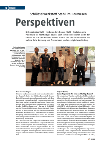 Schl%u00fcsselwerkstoff Stahl im BauwesenPerspektivenNichtrostender Stahl %u2013 insbesondere Duplex-Stahl %u2013 bietet enorme Potenziale f%u00fcr nachhaltiges Bauen. Doch in vielen Bereichen steckt derEinsatz noch in den Kinderschuhen. Warum sich dies %u00e4ndern sollte und welche Rolle Normung und Praxiswissen spielen, zeigt dieser Beitrag.Von Thomas R%u00f6perStahl ist im Bauwesen weit mehr als ein altbew%u00e4hrter Baustoff. Er ist ein Schl%u00fcsselwerkstoff, dessen Entwicklung und Anwendung untrennbar mit dem Anspruch verbunden sind, ressourcenschonend, langlebig und wirtschaftlich zu bauen. Das wurde einmal mehr deutlich beim Fachseminar %u201eNichtrostender Stahl im Bauwesen%u201c, das am 1. Juli 2025 an der Universit%u00e4t Duisburg-Essen stattfand. Organisiert in Kooperation mit der Informationsstelle Edelstahl Rostfrei (ISER) und der Forschungsvereinigung Stahlanwendung (FOSTA), bot die Veranstaltung ein eindrucksvolles Panorama aktueller Forschung und Praxis.Im Zentrum stand die Frage, wie moderne nichtrostende Stahlsorten %u2013 allen voran Duplex-St%u00e4hle %u2013 zu einer nachhaltigeren Bauweise beitragen k%u00f6nnen. Diese Werkstoffe vereinen Eigenschaften, die f%u00fcr zukunftsorientierte Bauprojekte entscheidend sind: hohe Festigkeit, hervorragende Korrosionsbest%u00e4ndigkeit und eine nahezu verlustfreie Rezyklierbarkeit.Duplex-Stahl: Starke Argumente f%u00fcr eine nachhaltige ZukunftDie technischen Vorteile von Duplex-St%u00e4hlen sind seit Jahren bekannt, sie werden jedoch im bauaufsichtlich geregelten Bereich erst nach und nach genutzt. Ihr zweiphasiges Gef%u00fcge aus Austenit und Ferrit erm%u00f6glicht eine hohe mechanische Festigkeit (Rp0,2 oft >400 MPa) bei gleichzeitig hoher Z%u00e4higkeit %u2013 eine Kombination, die klassischen Baust%u00e4hlen %u00fcberlegen ist. Damit lassen sich Konstruktionen mit d%u00fcnneren Wanddicken realisieren, was Material und Gewicht spart und folglich Transport- und Montageaufw%u00e4nde reduziert. Auch die Korrosionsbest%u00e4ndigkeit ist durch die Bildung einer passiven Chromoxidschicht beeindruckend: W%u00e4hrend konventionelle Baust%u00e4hle aufw%u00e4ndig gesch%u00fctzt und regelm%u00e4%u00dfig saniert werden m%u00fcssen, bleibt Duplex-Stahl in vielen Anwendungen jahrzehntelang nahezu wartungsfrei.Das Beispiel der AVA-Fu%u00dfg%u00e4ngerbr%u00fccke (vgl. www.avabridge.com), vorgestellt von Markus Buckner (Outokumpu Nirosta), belegt dies eindrucksvoll: eine modulare Konstruktion aus Duplex-Stahl (1.4162, Technische Berater des Bundesverbands Metall mit Prof. Dr.-Ing. Natalie Strangh%u00f6ner beim Fachseminar %u201eNichtrostender Stahl im Bauwesen%u201c an der Universit%u00e4t DuisburgEssen (v. l. n. r. Nisanthan, R%u00f6per, Prof. Dr.-Ing. Strangh%u00f6ner, Zimmer, Kania, Dr.-Ing. Fandrich)Fotos: Thomas R%u00f6per16 Aktuell05|25