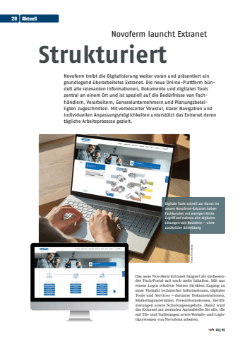 Novoferm launcht ExtranetDas neue Novoferm Extranet fungiert als umfassendes Fach-Portal mit noch mehr Inhalten. Mit nur einem Login erhalten Nutzer direkten Zugang zu einer Vielzahl technischer Informationen, digitaler Tools und Services %u2013 darunter Dokumentationen, Marketingmaterialien, Preisinformationen, Zertifizierungen sowie Schulungsangebote. Damit wird das Extranet zur zentralen Anlaufstelle f%u00fcr alle, die mit T%u00fcr- und Torl%u00f6sungen sowie Verlade- und Logistiksystemen von Novoferm arbeiten. Novoferm treibt die Digitalisierung weiter voran und pr%u00e4sentiert ein grundlegend %u00fcberarbeitetes Extranet. Die neue Online-Plattform b%u00fcndelt alle relevanten Informationen, Dokumente und digitalen Tools zentral an einem Ort und ist speziell auf die Bed%u00fcrfnisse von Fachh%u00e4ndlern, Verarbeitern, Generalunternehmern und Planungsbeteiligten zugeschnitten. Mit verbesserter Struktur, klarer Navigation und individuellen Anpassungsm%u00f6glichkeiten unterst%u00fctzt das Extranet deren t%u00e4gliche Arbeitsprozesse gezielt.Fotos: NovofermStrukturiert20 Aktuell05|25Digitale Tools schnell zur Hand: Im neuen Novoferm-Extranet haben Fachkunden mit wenigen Klicks Zugriff auf nahezu alle digitalen L%u00f6sungen von Novoferm %u2013 ohne zus%u00e4tzliche Anmeldung