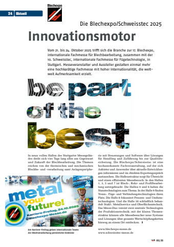 Die Blechexpo/Schweisstec 2025InnovationsmotorVom 21. bis 24. Oktober 2025 trifft sich die Branche zur 17. Blechexpo, internationale Fachmesse f%u00fcr Blechbearbeitung, zusammen mit der 10. Schweisstec, internationale Fachmesse f%u00fcr F%u00fcgetechnologie, in Stuttgart. Messeveranstalter und Aussteller gestalten einmal mehr eine hochkar%u00e4tige Fachmesse mit hoher Internationalit%u00e4t, die weltweit Aufmerksamkeit erzielt.In neun vollen Hallen des Stuttgarter Messegel%u00e4ndes dreht sich vier Tage lang alles um Gegenwart und Zukunft der Blechbearbeitung. Die Themen reichen von der thermischen und mechanischen Blechbe- und -verarbeitung samt Anlagenperipherie mit Steuerungen und Software %u00fcber L%u00f6sungen f%u00fcr Handling und Zuf%u00fchrung bis zur Qualit%u00e4tssicherung. Die Blechexpo/Schweisstec ist eine hochanerkannte Fachveranstaltung, auf der sich Anbieter und Anwender %u00fcber aktuelle Entwicklungen informieren und im direkten Expertengespr%u00e4ch austauschen. Die Hallenstruktur sorgt f%u00fcr %u00dcbersicht und einen effizienten Messebesuch: In den Hallen 1, 3, 5 und 7 ist Blech-, Rohr- und Profilbearbeitung untergebracht. Die Hallen 4 und 6 haben die Stanztechnologien zum Thema. In der Halle 9 finden Trenn-, F%u00fcge- und Verbindungstechnologien ihren Platz. Die Halle 8 fokussiert Pressen- und Umformtechnologien. Und die Halle 10 schlie%u00dflich behandelt Stahl-, Metallservice und Oberfl%u00e4chentechnik. Das Messe-Duo vereint zwei zentrale Technologien der Produktionstechnik; mit der klaren Themenstruktur k%u00f6nnen alle Messebesucher neue Systeme und L%u00f6sungen %u00fcber gesamte Wertsch%u00f6pfungsketten hinweg an einem Ort entdecken. ywww.blechexpo-messe.dewww.schweisstec-messe.deAm Karriere-Freitag geben internationale Teams der Blechverarbeitung pers%u00f6nliche Einblicke24 Aktuell05|25