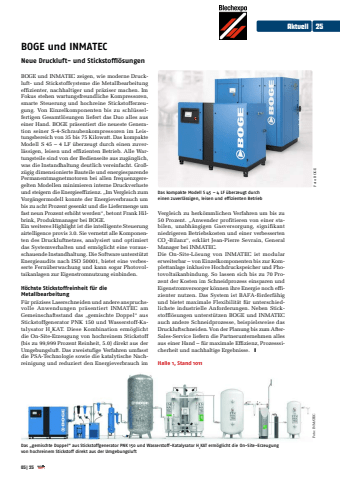 BOGE und INMATEC Neue Druckluft- und Stickstoffl%u00f6sungenBOGE und INMATEC zeigen, wie moderne Druckluft- und Stickstoffsysteme die Metallbearbeitung effizienter, nachhaltiger und pr%u00e4ziser machen. Im Fokus stehen wartungsfreundliche Kompressoren, smarte Steuerung und hochreine Stickstofferzeugung. Von Einzelkomponenten bis zu schl%u00fcsselfertigen Gesamtl%u00f6sungen liefert das Duo alles aus einer Hand. BOGE pr%u00e4sentiert die neueste Generation seiner S-4-Schraubenkompressoren im Leistungsbereich von 35 bis 75 Kilowatt. Das kompakte Modell S 45 %u2013 4 LF %u00fcberzeugt durch einen zuverl%u00e4ssigen, leisen und effizienten Betrieb. Alle Wartungsteile sind von der Bedienseite aus zug%u00e4nglich, was die Instandhaltung deutlich vereinfacht. Gro%u00dfz%u00fcgig dimensionierte Bauteile und energiesparende Permanentmagnetmotoren bei allen frequenzgeregelten Modellen minimieren interne Druckverluste und steigern die Energieeffizienz. %u201eIm Vergleich zum Vorg%u00e4ngermodell konnte der Energieverbrauch um bis zu acht Prozent gesenkt und die Liefermenge um fast neun Prozent erh%u00f6ht werden%u201c, betont Frank Hilbrink, Produktmanager bei BOGE.Ein weiteres Highlight ist die intelligente Steuerung airtelligence provis 3.0. Sie vernetzt alle Komponenten des Druckluftnetzes, analysiert und optimiert das Systemverhalten und erm%u00f6glicht eine vorausschauende Instandhaltung. Die Software unterst%u00fctzt Energieaudits nach ISO 50001, bietet eine verbesserte Fern%u00fcberwachung und kann sogar Photovoltaikanlagen zur Eigenstromnutzung einbinden.H%u00f6chste Stickstoffreinheit f%u00fcr dieMetallbearbeitung F%u00fcr pr%u00e4zises Laserschneiden und andere anspruchsvolle Anwendungen pr%u00e4sentiert INMATEC am Gemeinschaftsstand das %u201egemischte Doppel%u201c aus Stickstoffgenerator PNK 150 und Wasserstoff-Katalysator H2KAT. Diese Kombination erm%u00f6glicht die On-Site-Erzeugung von hochreinem Stickstoff (bis zu 99,999 Prozent Reinheit, 5.0) direkt aus der Umgebungsluft. Das zweistufige Verfahren umfasst die PSA-Technologie sowie die katalytische Nachreinigung und reduziert den Energieverbrauch im Vergleich zu herk%u00f6mmlichen Verfahren um bis zu 50 Prozent. %u201eAnwender profitieren von einer stabilen, unabh%u00e4ngigen Gasversorgung, signifikant niedrigeren Betriebskosten und einer verbesserten CO2-Bilanz%u201c, erkl%u00e4rt Jean-Pierre Sevrain, General Manager bei INMATEC.Die On-Site-L%u00f6sung von INMATEC ist modular erweiterbar %u2013 von Einzelkomponenten bis zur Komplettanlage inklusive Hochdruckspeicher und Photovoltaikanbindung. So lassen sich bis zu 70 Prozent der Kosten im Schneidprozess einsparen und Eigenstromversorger k%u00f6nnen ihre Energie noch effizienter nutzen. Das System ist BAFA-f%u00f6rderf%u00e4hig und bietet maximale Flexibilit%u00e4t f%u00fcr unterschiedlichste industrielle Anforderungen. Neben Stickstoffl%u00f6sungen unterst%u00fctzen BOGE und INMATEC auch andere Schneidprozesse, beispielsweise das Druckluftschneiden. Von der Planung bis zum AfterSales-Service liefern die Partnerunternehmen alles aus einer Hand %u2013 f%u00fcr maximale Effizienz, Prozesssicherheit und nachhaltige Ergebnisse. yHalle 1, Stand 1011Das kompakte Modell S 45 %u2013 4 LF %u00fcberzeugt durch einen zuverl%u00e4ssigen, leisen und effizienten BetriebFoto: BOGEDas %u201egemischte Doppel%u201c aus Stickstoffgenerator PNK 150 und Wasserstoff-Katalysator H2KAT erm%u00f6glicht die On-Site-Erzeugung von hochreinem Stickstoff direkt aus der UmgebungsluftFoto: INMATECAktuell 2505| 25