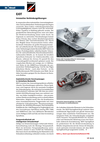 EJOTInnovative Verbindungsl%u00f6sungen In anspruchsvollen industriellen Anwendungsbereichen sind hochbelastbare Verbindungstechnologien essenziell. Diese hohen verbindungstechnischen Leistungsf%u00e4higkeiten m%u00fcssen auch mit wirtschaftlichen Aspekten in Einklang gebracht werden. Bei ganzheitlicher Betrachtungsweise setzt sich daher die Direktverschraubung immer mehr durch. Im Gegensatz zu metrischen Verschraubungen kommt dieses Prinzip ohne weitere Bearbeitungsschritte wie Bohren oder Gewindeschneiden aus. Durch den Wegfall dieser Prozessschritte bieten selbstfurchende Schrauben ein gro%u00dfes Einsparpotenzial. Der auf selbstfurchende Verschraubungen spezialisierte Verbindungstechnik-Hersteller EJOT bietet ein breites Produktportfolio selbstfurchender Schrauben f%u00fcr unterschiedlichste Einschraubmaterialien, insbesondere Metalle, an. So kommt die bew%u00e4hrte Spiralform-Schraube bei Stahlwerkstoffen zum Einsatz, w%u00e4hrend die ALtracs Xt speziell f%u00fcr den Anwendungsfall Leichtmetall optimiert wurde. Bei vorgelochten Blechen mit weniger als 1,5 Millimetern Dicke ist die SHEETtracs-Schraube die prozesssichere Verbindungsl%u00f6sung. Und f%u00fcr das F%u00fcgen h%u00f6herfester Bleche %u2013 auch ohne Vorloch %u2013 ist die flie%u00dflochformende FDS-Schraube erste Wahl. Sie ist daher besonders geeignet f%u00fcr den Einsatz im Karosserie-Rohbau. Gewindefurchende Verschraubungenin h%u00f6chstfeste Werkstoffe EJOT erweitert das Anwendungsspektrum selbstfurchender Verschraubungen sukzessive. Dieses Spektrum wird begrenzt durch die maximale Festigkeit der Schraubenspitze, die sich beim Gewindefurchen nicht plastisch verformen darf. Mit dem neu entwickelten MAXXtip-Konzept kann nun realisiert werden, was bisher unm%u00f6glich erschien %u2013 eine prozesssichere Direktverschraubung auch in ultrahochfeste Materialien. M%u00f6glich macht dies die Kombination eines einsatzbainitisierten Traggewindes mit einer ultraharten Schraubenspitze. Hauptanwendungsbereiche des MAXXtip-Konzeptes sind h%u00f6chstfeste Stahlbleche (bis 1200 Megapascal Zugfestigkeit) mit den Gewindetypen Spiralform (analog DIN 7500) und SHEETtracs (bis zwei Millimeter Blechdicke) sowie Stahlguss (GJS und GJL) mit dem Gewindetyp Spiralform. Vorspannkrafterhalt mit intelligentem Schraubenkopf Infolge von Setzerscheinungen verliert jede Schraubenverbindung nach der Montage Vorspannkraft. Wird ein kritisches Vorspannkraftniveau unterschritten, kommt es zum Ausfall der Verbindung. Dies kann durch eine Erh%u00f6hung der Elastizit%u00e4t in der Schraubenverbindung verhindert werden, wie durch die Aufnahme federnder Elemente in der Schraubenstrecke. Der EJOT-SpringHead-Kopf realisiert diese nachfedernde Eigenschaft und gleicht Setzerscheinungen ohne zus%u00e4tzliche Federelemente aus. Die integrierte Feder des Schraubenkopfes erm%u00f6glicht einen besseren Vorspannkrafterhalt bei dynamischer und thermischer Belastung sowie eine dauerhafte elektrische Kontaktierung. EJOT SpringHead ist pr%u00e4destiniert f%u00fcr die Direktverschraubung in Metalle, beispielsweise mit der ALtracs Xt Schraube. Auch metrische Gewinde k%u00f6nnen mit dem EJOTSpringHead-Kopf ausgestattet werden. yHalle 5, Stand 5412 (Gemeinschaftsstand EFB)Fotos: EJOTBreites EJOT-Produktportfolio f%u00fcr Verbindungen in h%u00f6chstfeste BlechwerkstoffePotenzielle Anwendungsfelder der MAXXtip-Schrauben im Automobilbereich 26 Aktuell05|25