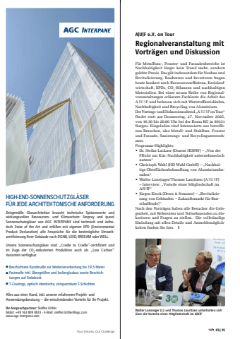 A|U|F e.V. on TourRegionalveranstaltung mit Vortr%u00e4gen und DiskussionF%u00fcr Metallbau-, Fenster- und Fassadenbetriebe ist Nachhaltigkeit l%u00e4ngst kein Trend mehr, sondern gelebte Praxis. Das gilt insbesondere f%u00fcr Neubau und Revitalisierung. Bauherren und Investoren fragen heute konkret nach Ressourceneffizienz, Kreislaufwirtschaft, EPDs, CO2-Bilanzen und nachhaltigen Materialien. Bei einer neuen Reihe von Regionalveranstaltungen erl%u00e4utern Fachleute die Arbeit des A|U|F und befassen sich mit Wertstoffkreisl%u00e4ufen, Nachhaltigkeit und Recycling von Aluminium. Der Vortrags- und Diskussionsabend %u201eA|U|F on Tour%u201c findet statt am Donnerstag, 27. November 2025, von 16.30 bis 20.00 Uhr bei der Roma KG in 89331 Burgau. Eingeladen sind Interessierte aus betroffenen Branchen, also Metall- und Stahlbau, Fenster und Fassade, Sanierungs- und Recyclingunternehmen.Programm-Highlights:%u2022 Dr. Stefan Lackner (Dozent HDBW) %u2013 %u201eVon der Pflicht zur K%u00fcr: Nachhaltigkeit unternehmerisch nutzen%u201c%u2022 Christoph Wahl (HD Wahl GmbH) %u2013 %u201eNachhaltige Oberfl%u00e4chenbehandlung von Aluminiumfassaden%u201c%u2022 Walter Lonsinger/Thomas Lauritzen (A|U|F) %u2013 Intervie %u201eVorteile einer Mitgliedschaft im AIUIF%u201c%u2022 J%u00fcrgen Einck (Drees & Sommer) %u2013 %u201eRevitalisierung von Geb%u00e4uden %u2013 Zukunftsmarkt f%u00fcr Bauschaffende?%u201cNach den Vortr%u00e4gen haben alle Besucher die Gelegenheit, mit Referenten und Teilnehmenden zu diskutieren und Fragen zu stellen. Die vollst%u00e4ndige Einladung mit allen Details und Anmeldem%u00f6glichkeiten finden Sie hier. yWalter Lonsinger (r.) und Thomas Lauritzen unterhalten sich %u00fcber die Vorteile einer Mitgliedschaft im A|U|F05|25HIGH-END-SONNENSCHUTZGL%u00c4SER F%u00dcR JEDE ARCHITEKTONISCHE ANFORDERUNGZeitgem%u00e4%u00dfe Glasarchitektur braucht technische Spitzenwerte und wirkungsvollen Ressourcen- und Klimaschutz: Stopray und ipasol Sonnenschutzgl%u00e4ser von AGC INTERPANE sind technisch und %u00e4sthetisch State of the Art und erf%u00fcllen mit eigenen EPD (Environmental Product Declaration) alle Anspr%u00fcche f%u00fcr die bestm%u00f6gliche Umweltzertifizierung Ihrer Geb%u00e4ude nach DGNB, LEED, BREEAM oder WELL. Unsere Sonnenschutzgl%u00e4ser sind %u201eCradle to Cradle%u201c-zertifiziert und im Zuge der CO2-reduzierten Produktion auch als %u201eLow Carbon%u201c Varianten verf%u00fcgbar.%u25a0 Beschichtete Bandma%u00dfe zur Weiterverarbeitung bis 19,5 Meter%u25a0 Festma%u00dfe inkl. %u00dcbergr%u00f6%u00dfen und Isolierglasbau sowie Beschichtungen auf Siebdruck%u25a0 T-Coatings, optisch identische, vorspannbare T-SchichtenAlles aus einer Hand, inkl. unserer erfahrenen Projekt- und Anwendungsberatung %u2212 die entscheidenden Vorteile f%u00fcr Ihr Projekt.Ihr Ansprechpartner: Steffen KittlerMobil: +49 163 809 0833 - E-Mail: steffen.kittler@agc.comwww.agc-interpane.comHIGH-END-SONNENSCHUTZGL%u00c4SER F%u00dcR JEDE ARCHITEKTONISCHE ANFORDERUZeitgem%u00e4%u00dfe Glasarchitektur braucht technische Spitzenwerte wirkungsvollen Ressourcen- und Klimaschutz: Stopray und ip sind technisch und %u00e4INTERPANE Sonnenschutzgl%u00e4ser von AGC tisch State of the Art und erf%u00fcllen mit eigenen EPD (EnvironmProduct Declaration) alle Anspr%u00fcche f%u00fcr die bestm%u00f6gliche Umwzertifizierung Ihrer Geb%u00e4ude nach DGNB, LEED, BREEAM oder WELUnsere Sonnenschutzgl%u00e4ser sind %u201eCradle to Cradle%u201c-zertifiziert im Zuge der CO2-reduzierten Produktion auch als %u201eLow CarVarianten verf%u00fcgbar.Beschichtete Bandma%u00dfe zur Weiterverarbeitung bis 19,5 Meter %u25a0Festma%u00dfe inkl. %u00dcbergr%u00f6%u00dfen und Isolierglasbau sowie Beschich- %u25a0tungen auf SiebdruckT-Coatings, optisch identische, vorspannbare T-Schichten %u25a0Alles aus einer Hand, inkl. unserer erfahrenen Projekt- und Anwendungsberatung %u2212 die entscheidenden Vorteile f%u00fcr Ihr Projek Steffen Kittler Ihr Ansprechpartner:Mobil: +49 163 809 0833 - E-Mail: steffen.kittler@agc.comwww.agc-interpane.com
