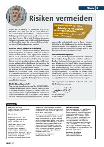 ImpressumRisiken vermeidenHaben Sie am Dienstag, 25. November 2026, f%u00fcr 90 Minuten Zeit? Dann lade ich Sie schon heute ein, an unserem Webinar zum Thema %u201eAbsturzsichernde Befestigungen%u201c teilzunehmen. Auch wenn Sie wissen, dass Fenster, T%u00fcren und Br%u00fcstungen tragende Sicherheitselemente sind, erf%u00fcllen viele Beispiele aus der Praxis nicht immer die hohen rechtlichen Anforderungen. Und das kann teuer werden.Webinar %u201eAbsturzsichernde Befestigung%u201cUm Sie auf die Thematik einzustimmen, haben wir Fachleute gebeten, Beitr%u00e4ge zu verfassen und neue Produkte vorzustellen. Unser %u201eSpezial zum Webinar%u201c finden Sie ab Seite 90 in diesem E-Paper. Besonders gefreut habe ich mich, dass wir Dipl.-Ing. Hermann Hamm als Autor gewinnen konnten. Er schildert aus seiner umfangreichen Erfahrung als Ingenieur f%u00fcr Baustatik, Glas und Stahlbau, wo Fallstricke lauern %u2013 und wie sich diese vermeiden lassen.Im Webinar am 25. November werden die beiden Referenten, Fachanwalt Frank Zillmer und Fachspezialist Benedict Hauswirth, das notwendige Fachwissen vermitteln. Ziel ist, dass Sie zugelassene Produkte einsetzen und m%u00f6gliche Haftungsrisiken fr%u00fchzeitig ausschlie%u00dfen k%u00f6nnen.Die Marktmacht %u201ewackelt%u201cVon meinen Messebesuchen auf der SCHWEISSEN + SCHNEIDEN in Essen und der EMO in Hannover habe ich etliche Neuheiten mitgebracht, die wir Ihnen zum Teil schon in dieser Ausgabe vorstellen. Erstaunt hat mich die wachsende Zahl an Anbietern von Schwei%u00dftischen. Knapp ein Dutzend Hersteller und H%u00e4ndler www.metall-markt.netmetall-markt.net, 13. Jahrgang 2025info@pse-redaktion.deISSN 2195-6715PSE Redaktionsservice GmbHKirchplatz 8 %u00b7 82538 GeretsriedTelefon +49 (0)8171 9118-70 Chefredakteur: Stefan Elga%u00dfelgass@pse-redaktion.deAnzeigenleitung: Petra Ferstl,petra.ferstl@pse-redaktion.deAnzeigenverkauf: Nach einer Pause ist Veronika Scherz wieder als bew%u00e4hrte Kollegin zur%u00fcck am Telefon: veronika.scherz@pse-redaktion.deVer%u00f6ffentlichungenEingereichte Beitr%u00e4ge und Abbildungen gehen im Rahmen der gesetzlichen Bestimmungen in das Ver%u00f6ffentlichungsund Verarbeitungsrecht von PSE %u00fcber. %u00dcberarbeiten und K%u00fcrzen von Texten liegen im Ermessen der Redaktion. Die inhaltliche Verantwortung gekennzeichneter Beitr%u00e4ge %u00fcbernimmt der Verfasser. Die Hinweise auf Bildautoren und -rechte finden Sie jeweils bei den Abbildungen. Wird kein Autor genannt, hat das Bild die im dazugeh%u00f6renden Text genannte Firma gestellt.Layout und Gestaltung Page Pro Media GmbH www.pagepro-media.deTitelfoto: Die neue Fassade des SAP garden in M%u00fcnchen war eine Gemeinschaftsleistung des Metallbau-Teams von Frener & Reifer aus Brixen. Foto: Frener&ReiferWir haben uns auf Fachtitel rund um Metalle und Metallbau spezialisiert. Neben metallmarkt.net bekommen Sie bei uns auch die Fachzeitung ALUMINIUM KURIER. Davor haben wir %u00fcber 20 Jahre das Fachmagazin metallbau redaktionell betreut und gestaltet. metallmarkt.net erscheint in digitaler Form als E-Paper. Metallbau-Unternehmen k%u00f6nnen einen 14-t%u00e4gig erscheinenden Newsletterzusammen mit dem E-Paper anfordern. Kosten entstehen keine. Die Registrierung erfolgt unter www.metall-markt.netaus dem In- und Ausland waren in Essen vertreten. Offenbar ist die Marktmacht der beiden Branchenf%u00fchrer Demmeler und Siegmund etwas ins Wanken geraten %u2013 oder ihre Preispolitik hat sich ger%u00e4cht. Wir werden das f%u00fcr Sie weiter beobachten.Investitionen sind geplantAuch wenn der Konjunkturmotor noch nicht rund l%u00e4uft, sind die Perspektiven im Metallbau nicht trostlos. Ihre Nachfrage bei den Anbietern von Maschinen und Werkzeugen ist stabil. Viele Messeteilnehmer und Zulieferer berichten von regem Kundeninteresse. Besonders gefragt sind Produkte, Verfahren und Maschinen, die eine automatisierte und rationelle Fertigung erm%u00f6glichen. %u201eWir rechnen mit Investitionen der Kunden %u2013 gerade zum Jahresende%u201c, so der Tenor vieler Partner des Metallhandwerks sowie zahlreicher Anzeigenkunden und Fachpartner dieser Ausgabe.Viel Vergn%u00fcgen beim Bl%u00e4ttern in diesem Heft %u2013 und bleiben Sie uns gewogen.Ihr Stefan Elga%u00df, ChefredakteurDAS PRAXIS-WEBINAR ZUM THEMA: %u201eBefestigung von absturzsichernden Bauteilen%u201c25. November 2025, 10 bis 11.30 UhrInfos und Anmeldung...305 | 25Editorial