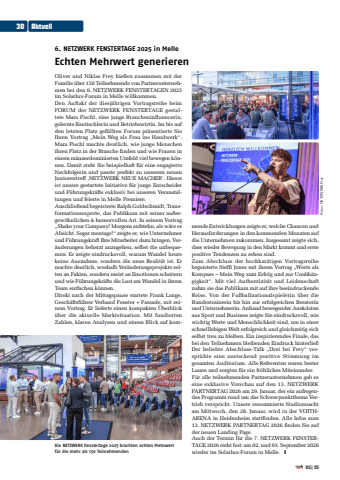 6. NETZWERK FENSTERTAGE 2025 in Melle Echten Mehrwert generierenOliver und Niklas Frey hie%u00dfen zusammen mit der Familie %u00fcber 150 Teilnehmende von Partnerunternehmen bei den 6. NETZWERK FENSTERTAGEN 2025 im Solarlux-Forum in Melle willkommen.Den Auftakt der diesj%u00e4hrigen Vortragsreihe beim FORUM der NETZWERK FENSTERTAGE gestaltete Mara Pischl, eine junge Brancheninfluencerin, gelernte Bautischlerin und Betriebswirtin. Im bis auf den letzten Platz gef%u00fcllten Forum pr%u00e4sentierte Sie Ihren Vortrag %u201eMein Weg als Frau ins Handwerk%u201c. Mara Pischl machte deutlich, wie junge Menschen ihren Platz in der Branche finden und wie Frauen in einem m%u00e4nnerdominierten Umfeld viel bewegen k%u00f6nnen. Damit steht Sie beispielhaft f%u00fcr eine engagierte Nachfolgerin und passte perfekt zu unserem neuen Juniorentreff %u201aNETZWERK NEUE MACHER%u2018. Dieser ist unsere gestartete Initiative f%u00fcr junge Entscheider und F%u00fchrungskr%u00e4fte exklusiv bei unseren Veranstaltungen und feierte in Melle Premiere. Anschlie%u00dfend begeisterte Ralph Goldschmidt, Transformationsexperte, das Publikum mit seiner au%u00dfergew%u00f6hnlichen & humorvollen Art. In seinem Vortrag %u201eShake your Company! Morgens aufstehn, als w%u00e4re es Absicht. Sogar montags!%u201c zeigte er, wie Unternehmer und F%u00fchrungskraft Ihre Mitarbeiter dazu bringen, Ver%u00e4nderungen beherzt anzugehen, selbst die unbequemen. Er zeigte eindrucksvoll, warum Wandel heute keine Ausnahme, sondern die neue Realit%u00e4t ist. Er machte deutlich, weshalb Ver%u00e4nderungsprojekte selten an Fakten, sondern meist an Emotionen scheitern und wie F%u00fchrungskr%u00e4fte die Lust am Wandel in ihrem Team entfachen k%u00f6nnen.Direkt nach der Mittagspause startete Frank Lange, Gesch%u00e4ftsf%u00fchrer Verband Fenster + Fassade, mit seinem Vortrag. Er lieferte einen kompakten %u00dcberblick %u00fcber die aktuelle Marktsituation. Mit fundierten Zahlen, klaren Analysen und einem Blick auf kommende Entwicklungen zeigte er, welche Chancen und Herausforderungen in den kommenden Monaten auf die Unternehmen zukommen. Insgesamt zeigte sich, dass wieder Bewegung in den Markt kommt und erste positive Tendenzen zu sehen sind.Zum Abschluss der hochkar%u00e4tigen Vortragsreihe begeisterte Steffi Jones mit ihrem Vortrag %u201eWerte als Kompass %u2013 Mein Weg zum Erfolg und zur Unabh%u00e4ngigkeit%u201c. Mit viel Authentizit%u00e4t und Leidenschaft nahm sie das Publikum mit auf ihre beeindruckende Reise. Von der Fu%u00dfballnationalspielerin %u00fcber die Bundestrainerin bis hin zur erfolgreichen Beraterin und Unternehmerin. Anhand bewegender Anekdoten aus Sport und Business zeigte Sie eindrucksvoll, wie wichtig Werte und Menschlichkeit sind, um in einer schnelllebigen Welt erfolgreich und gleichzeitig sich selbst treu zu bleiben. Ein inspirierendes Finale, das bei den Teilnehmern bleibenden Eindruck hinterlie%u00dfDer beliebte Abschluss-Talk %u201eDrei bei Frey%u201c verspr%u00fchte eine ansteckend positive Stimmung im gesamten Auditorium. Alle Referenten waren bester Laune und sorgten f%u00fcr ein fr%u00f6hliches Miteinander. F%u00fcr alle teilnehmenden Partnerunternehmen gab es eine exklusive Vorschau auf den 13. NETZWERK PARTNERTAG 2026 am 29. Januar, der ein aufregendes Programm rund um das Schwerpunktthema Vertrieb verspricht. Unsere renommierte Stadionnacht am Mittwoch, den 28. Januar, wird in der VOITHARENA in Heidenheim stattfinden. Alle Infos zum 13. NETZWERK PARTNERTAG 2026 finden Sie auf der neuen Landing Page.Auch der Termin f%u00fcr die 7. NETZWERK FENSTERTAGE 2026 steht fest: am 02. und 03. September 2026 wieder im Solarlux-Forum in Melle. yDie NETZWERK Fenstertage 2025 brachten echten Mehrwert f%u00fcr die mehr als 150 TeilnehmendenFotos: NETZWERK Frey30 Aktuell05|25
