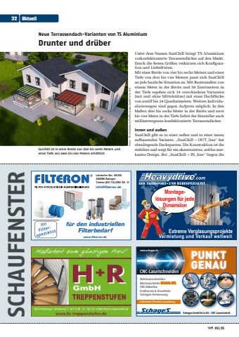 SCHAUFENSTERMontagel%u00f6sungen f%u00fcr jede DimensionExtreme VerglasungsprojekteVermietung und Verkauf weltweit %u00aeMedium: Metallmarkt.netVerlag: PSEFormat: 1/8 Seite 88 x 61 mmMotiv Punktgenau 22Farben: 4cStand g%u00fcltig ab 15.06.2022PunktgenauSchages GmbH & Co.KG %u00b7 CNC-Lasertechnikwww.schages.deRohrlaserschneiden Blechzuschnitte Mini bis XXL CNC-Abkanten Gro%u00dfserien & EinzelteileVorlagen-Vermessung individuell | flexibel | zuverl%u00e4ssigCNC-Laserschneidenf%u00fcr den industriellen FilterbedarfL%u00f6hdorfer Str. 30-3642699 SolingenTelefon (02 12) 262 33 - 0info@fi lteron.dewww.fi lteron.deNeue Terrassendach-Varianten von TS AluminiumDrunter und dr%u00fcberUnter dem Namen SunChill bringt TS Aluminium vorkonfektionierte Terrassend%u00e4cher auf den Markt. Durch die festen Gr%u00f6%u00dfen verk%u00fcrzen sich Konfiguration und Lieferfristen.Mit einer Breite von vier bis sechs Metern und einer Tiefe von drei bis vier Metern passt sich SunChill an jede bauliche Situation an. Mit Rasterma%u00dfen von einem Meter in der Breite und 50 Zentimetern in der Tiefe ergeben sich 14 verschiedene Varianten (mit und ohne Mittelst%u00fctze) mit einer Dachfl%u00e4che von zw%u00f6lf bis 24 Quadratmetern. Weitere Individualisierungen sind gegen Aufpreis m%u00f6glich: In den Ma%u00dfen drei bis sechs Meter in der Breite und zwei bis vier Meter in der Tiefe liefert der Hersteller auch millimetergenau konfektionierte Terrassend%u00e4cher.Innen und au%u00dfenSunChill gibt es in einer au%u00dfen und in einer innen aufbauenden Variante. %u201eSunChill %u2013 OUT_line%u201c hat obenliegende Dachsparren. Die Konstruktion ist die stabilere und sorgt f%u00fcr ein akzentuiertes, zeitlos markantes Design. Bei %u201eSunChill %u2013 IN_line%u201c liegen die SunChill ist in einer Breite von drei bis sechs Metern und einer Tiefe von zwei bis vier Metern erh%u00e4ltlichFotos: TS-Aluminium-Profilsysteme GmbH & Co. KG32 Aktuell05|25