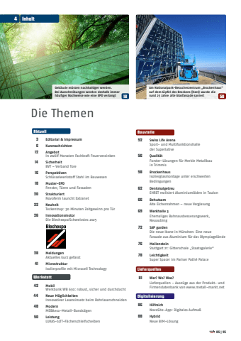 Die ThemenAktuell3 Editorial & Impressum6 Kurznachrichten12 Angebot In zw%u00f6lf Monaten Fachkraft Feuerverzinken14 SicherheitBVT %u2013 Verband Tore16 Perspektiven Schl%u00fcsselwerkstoff Stahl im Bauwesen18 Muster-EPD Fenster, T%u00fcren und Fassaden20 Strukturiert Novoferm launcht Extranet22 Neuheit Teckentrup: 30 Minuten Zeitgewinn pro T%u00fcr26 Innovationsmotor Die Blechexpo/Schweisstec 202528 Meldungen Aktuelles kurz gefasst41 Microstruktur Isolierprofile mit Microcell TechnologyWerkstatt42 Mobil Werkbank WB 630: robust, sicher und durchdacht44 Neue M%u00f6glichkeiten Innovativer Lasereinsatz beim Rohrlaserschneiden48 Modern MEBAeco-Metall-Bands%u00e4gen50 Leistung LUKAS-SLTT-F%u00e4cherschleifscheibenBaustelle52 Swiss Life Arena Sport- und Multifunktionshalle der Superlative56 Qualit%u00e4t Forster-L%u00f6sungen f%u00fcr Merkle Metallbau in Trimmis58 Brockenhaus Isolierglasmontage unter erschwerten Bedingungen 62 Denkmalgetreu EHRET realisiert Aluminiuml%u00e4den in Toulon66 Behutsam Alte Eichenrahmen %u2013 neue Verglasung69 Werkhalle 3 Ehemaliges Bahnausbesserungswerk, Neuaubing72 SAP garden Die neue Ikone in M%u00fcnchen: Eine neue Fassade aus Aluminium f%u00fcr das Olympiagel%u00e4nde76 Meilenstein Stuttgart 21: Gitterschale %u201eStaatsgalerie%u201c78 Leichtigkeit Super Spacer im Pariser Path%u00e9 PalaceLieferquellen81 Wer? Wo? Was? Lieferquellen %u2013 Ausz%u00fcge aus der Produkt- und Firmendatenbank von www.metall-markt.netDigitalisierung86 Hilfreich NovoSite-App: Digitales Aufma%u00df88 Hybrid Neue BIM-L%u00f6sungGeb%u00e4ude m%u00fcssen nachhaltiger werden. Bei Ausschreibungen werden deshalb immer h%u00e4ufiger Nachweise wie eine EPD verlangt 18 58Am Nationalpark-Besucherzentrum %u201eBrockenhaus%u201c auf dem Gipfel des Brockens (Harz) wurde die rund 25 Jahre alte Glasfassade saniert405|25Inhalt